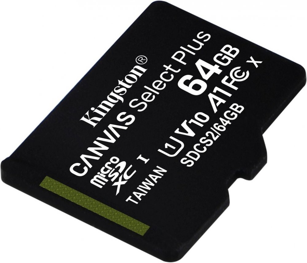 24 mm x 32 mm x 2.1 mm (s SD adaptérem)Paměťová karta Kingston Canvas Select Plus A1 typu micro SDXC poskytuje kapacitu 64 GB. Paměťová karta je ideálním řešením pro rozšíření kapacity úložiště v chytrých zařízeních, jako jsou mobilní telefony a tablety. Díky rychlosti čtení až 100 MB/s je vhodná také pro fotoaparáty a přenosné vidokamery. Zvýšená rychlost čtení dat umožňuje pořizovat videozáznamy ve Full HD rozlišení.