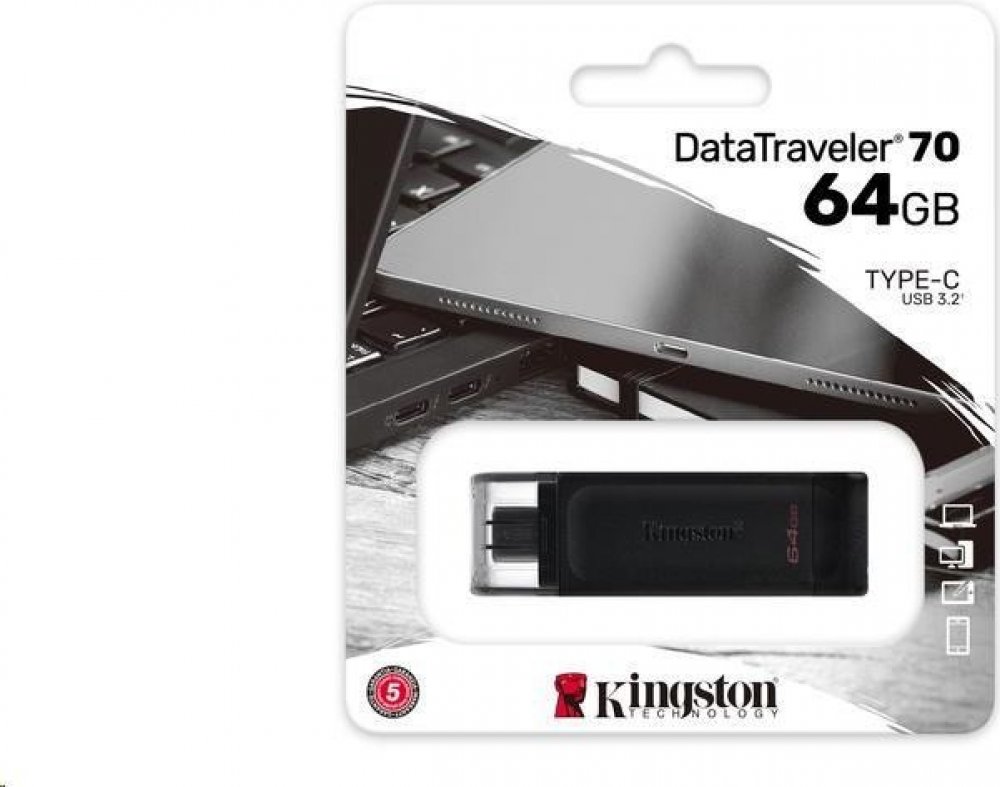 DataTraveler 70 značky Kingston je přenosný a lehký flash disk USB-C, který nabízí rychlosti rozhraní USB 3.2 1. generace. Je určen k použití s kompatibilními zařízeními USB-C, například notebooky, tablety a telef...
