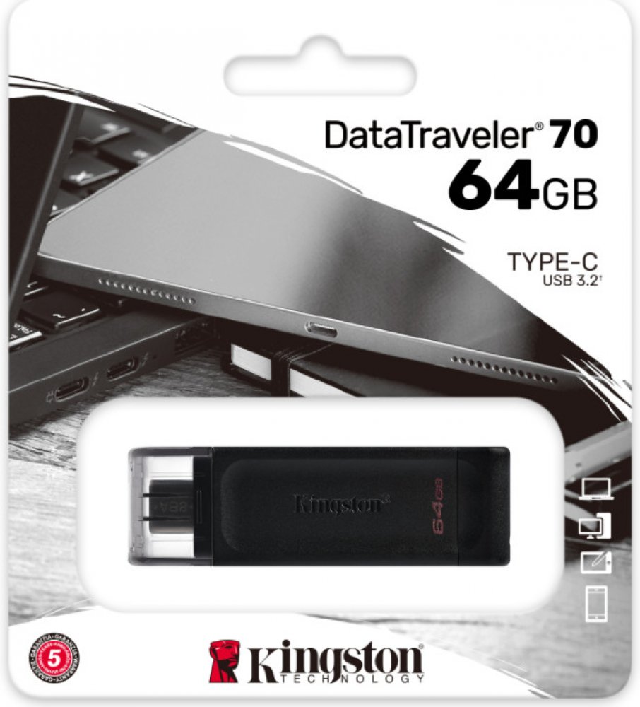 DataTraveler 70 značky Kingston je přenosný a lehký flash disk USB-C, který nabízí rychlosti rozhraní USB 3.2 1. generace. Je určen k použití s kompatibilními zařízeními USB-C, například notebooky, tablety a telefony. S kapacitami až do 128 GB dokáže disk DataTraveler70 velmi dobře rozšířit vaše úložiště pro každodenní použití. Vztahuje se na něj pětiletá záruka a bezplatná technická podpora.