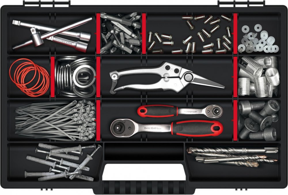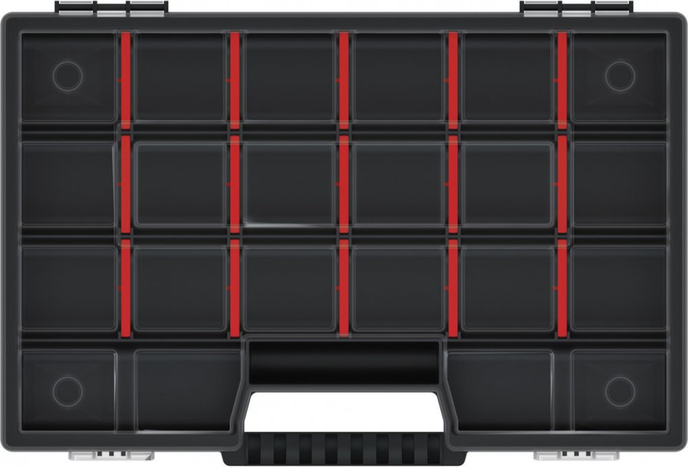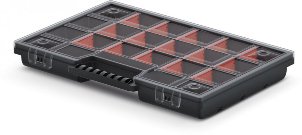přenosný kufřík s nastavitelnými přepážkami, kterými lze přizpůsobit velikost a počet přihrádek