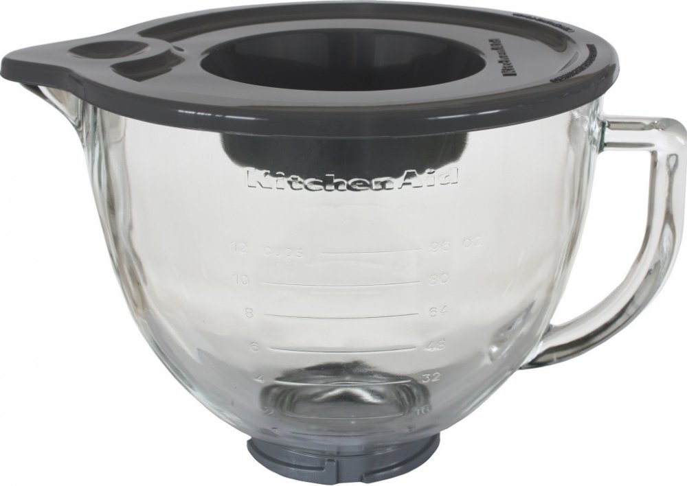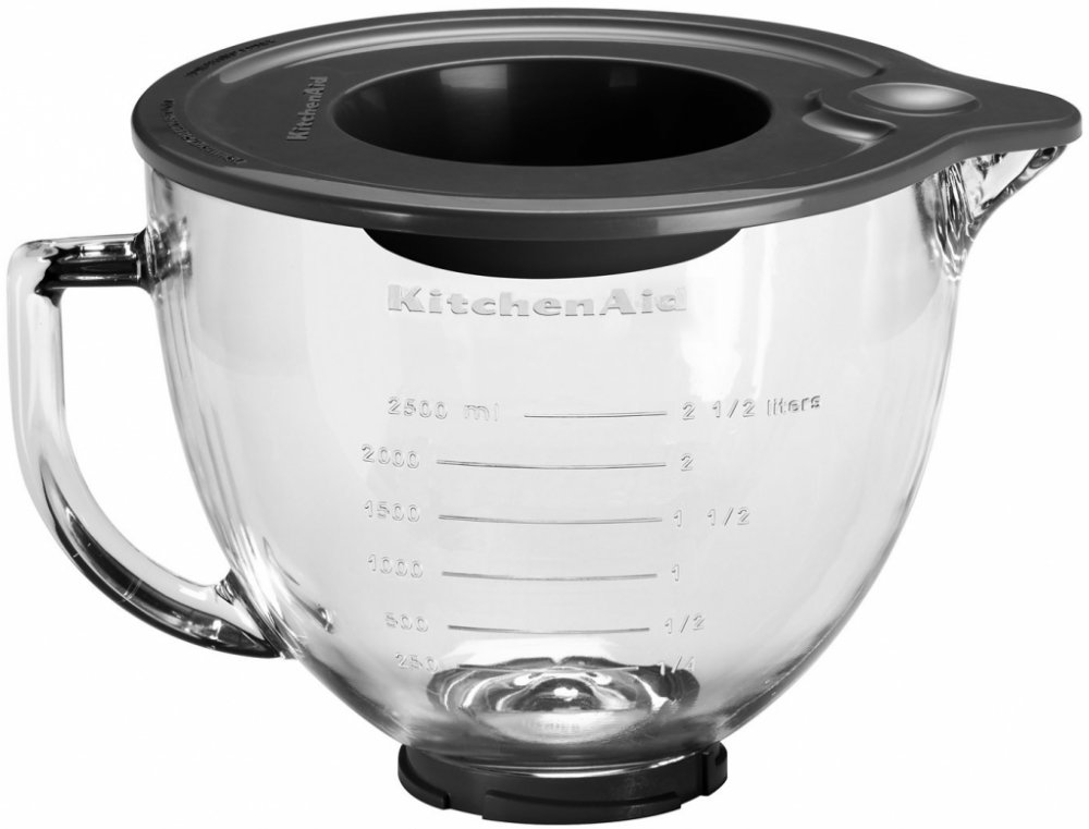 Mísa z tvrzeného skla s ergonomickou rukojetí a silikonovým víkem je kompatibilní se všemi typy robotů KitchenAid, KROMĚ kuchyňských robotů 5KSM3311 a řady Heavy duty a Profi (5KSM7580 a 5KSM7591).