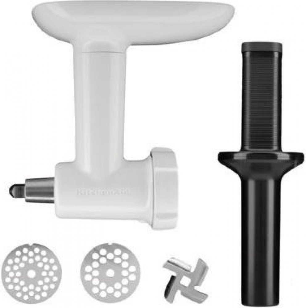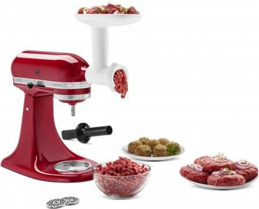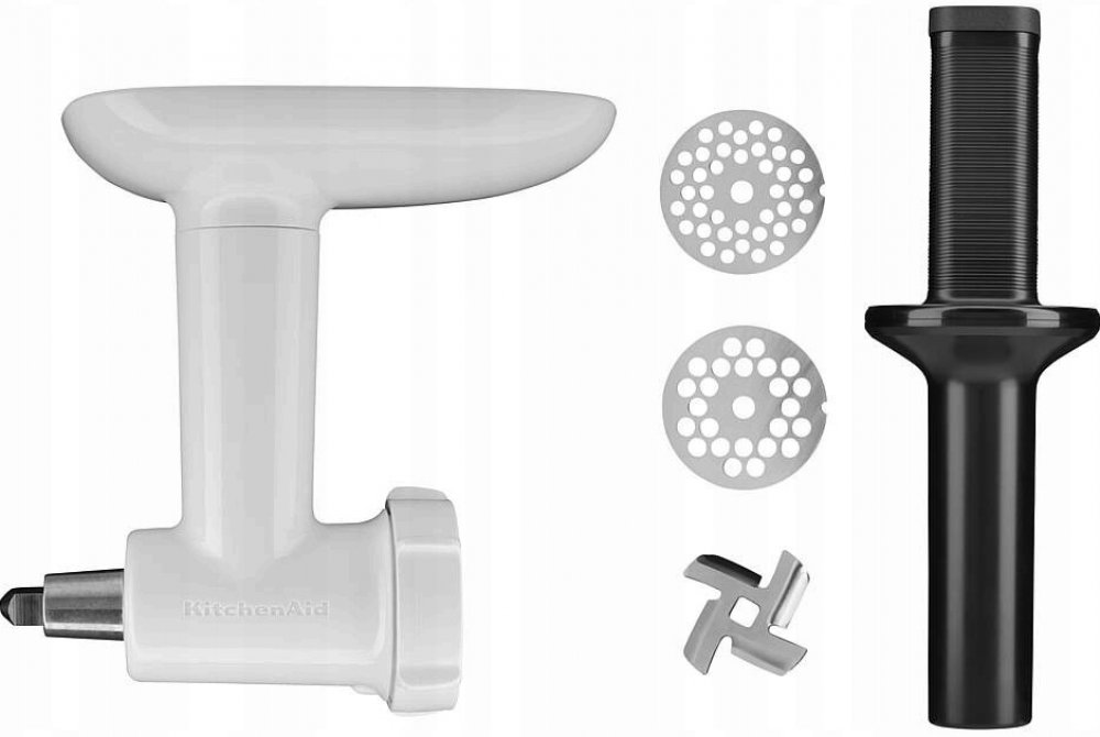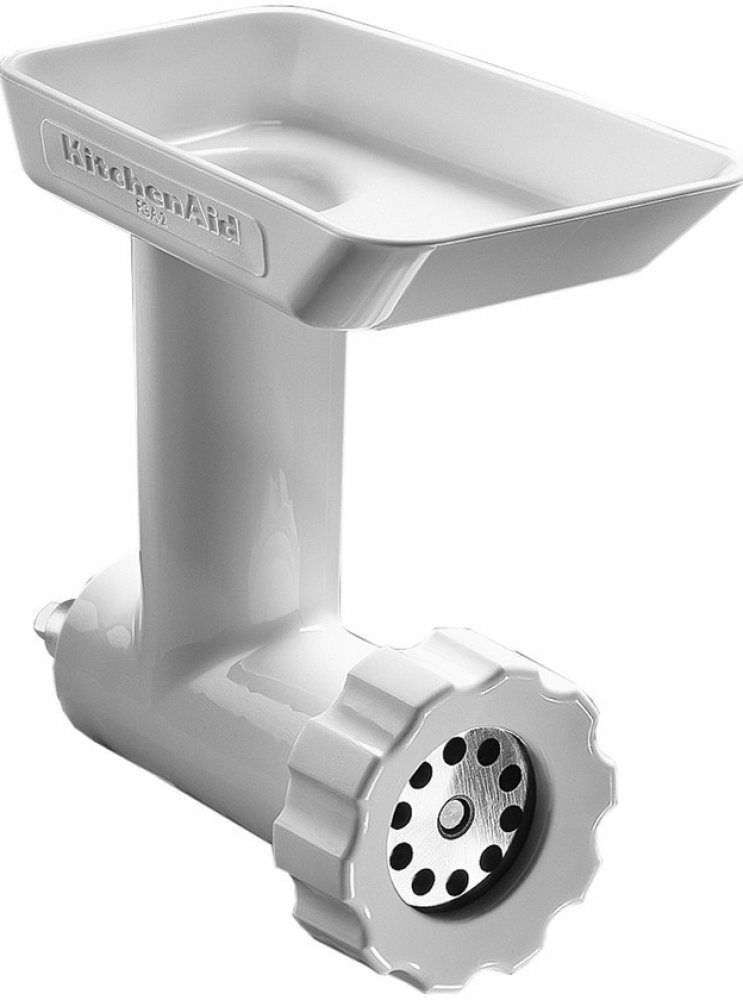 Přídavný mlýnek na potraviny 5KSMFGA. Vytvořte si z ingrediencí zdravé a čerstvé pokrmy, které si připravíte sami a navíc máte jistotu, že vše je čerstvé a ideálně namleté dle vašich představ. Mlýnek na maso 5KSMFGA s nástavci snadno a rychle zpracuje suroviny, pomůže s přípravou burgerů, paštik, salsy, pomele tvrdé sýry, pečivo a dětem připraví zdravou přesnídávku. Se snadným zatlačení jakéhokoli druhu potraviny směrem k noži pomůže pěchovač. Mlýnek je kompatibilní se všemi modely kuchyňských robotů KitchenAid.