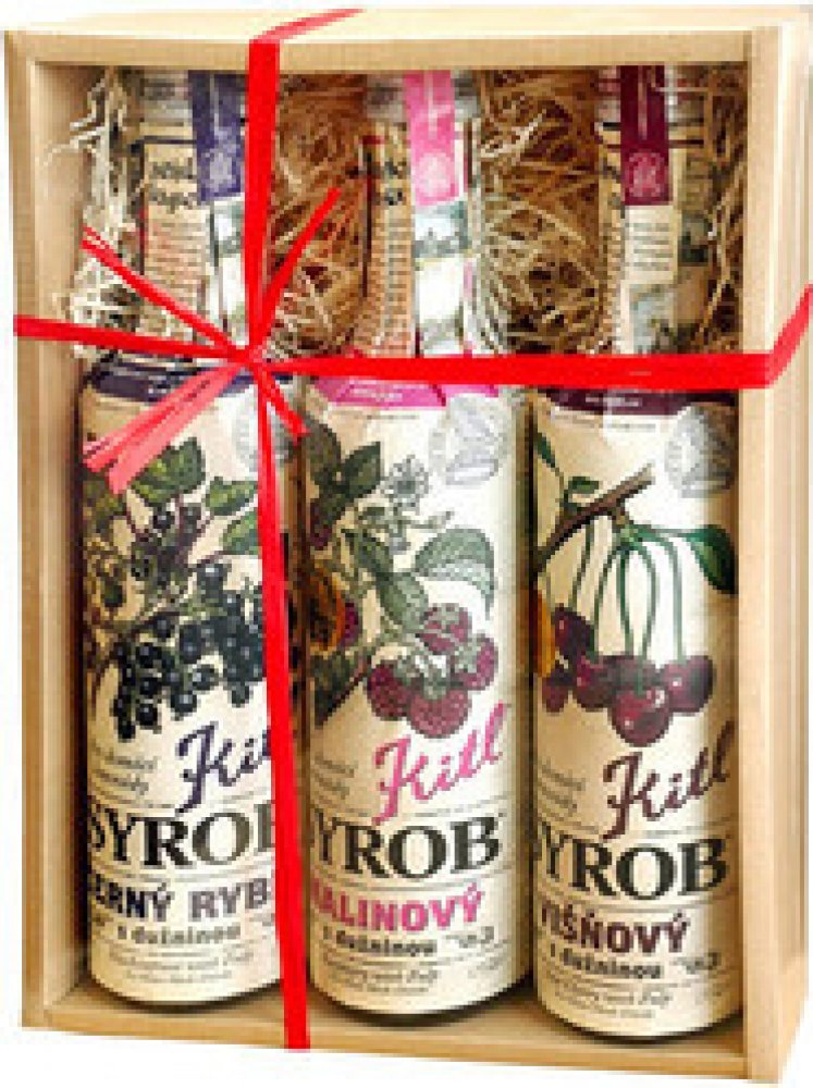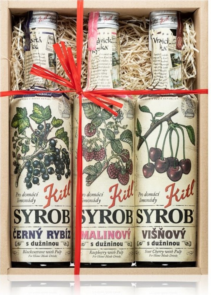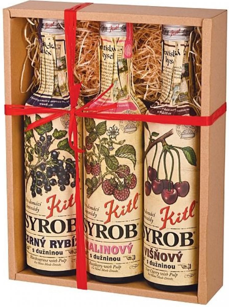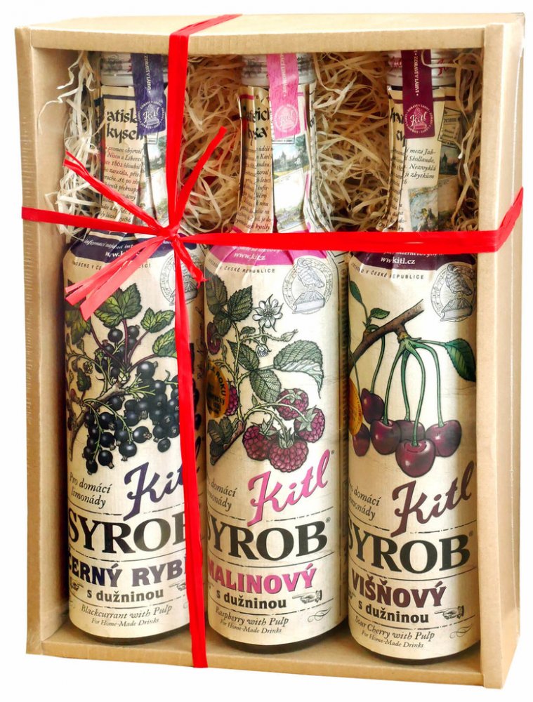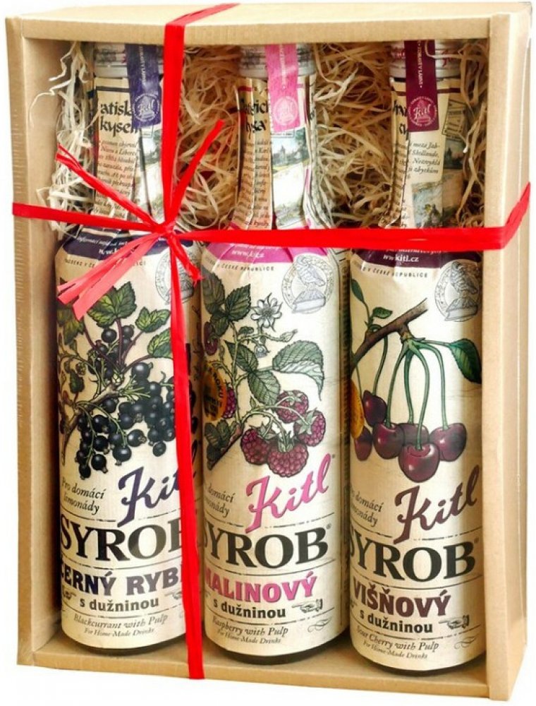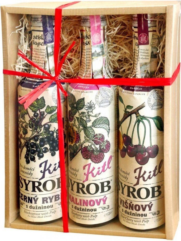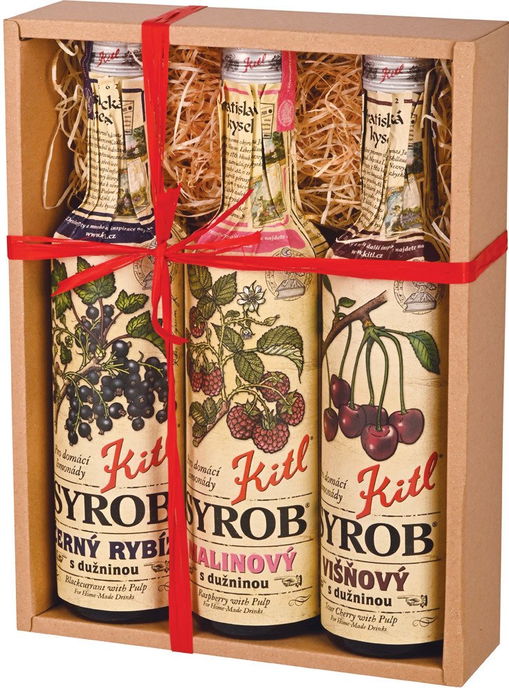 Dárkové balení ovocných sirupů Kitl z červeného ovoce. V balení jsou sirupy z ovocné řady: Kitl Syrob Višňový, Kitl Syrob Malinový a Kitl Syrob Černý rybíz. Sirupy Kitl jsou vhodné pro přípravu domácích limonád, nealkoholických i alkoholických koktejlů a na dochucení dezertů.