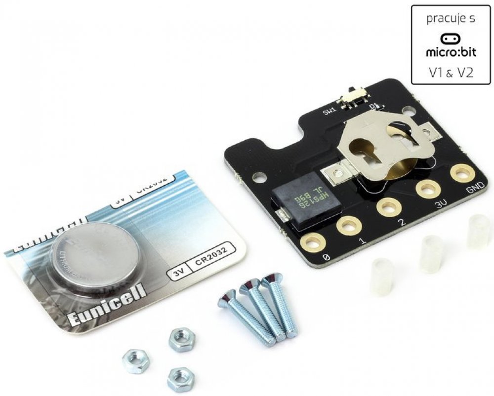 Rozšiřující modul pro napájení BBC micro:bit z vložené 3V baterie s piezo bzučákem a vypínačem.