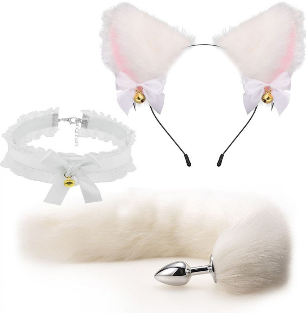 Kitten Play BDSM sada ouška obojek a liščí ocas Bílá