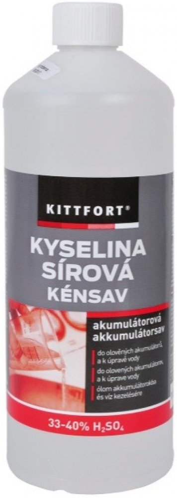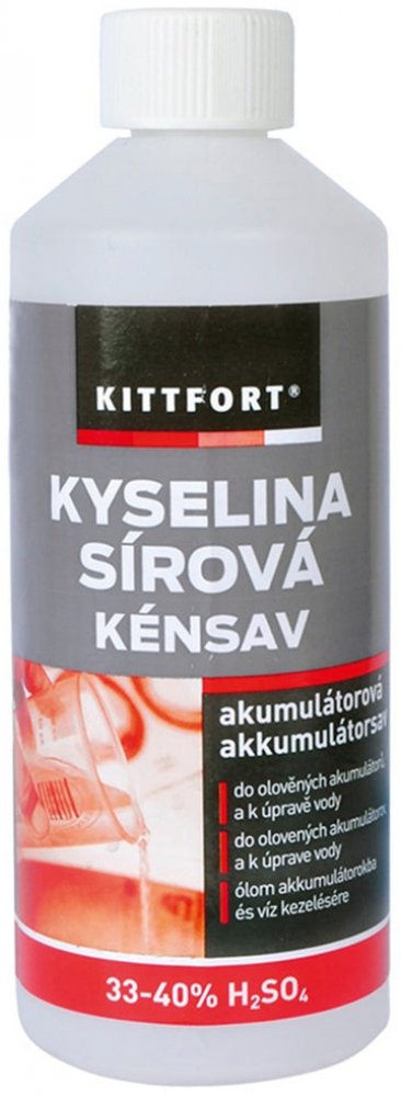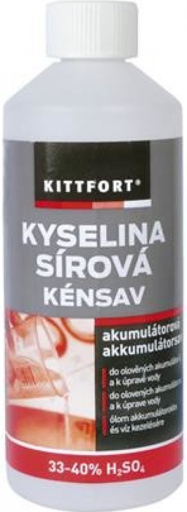 Kittfort Kyselina sírová 33-40% 0,5 l Kyselina sírová je technická kapalina, která se používá k povrchovému leptání a úpravám kovů, jako elektrolyt do olovněných akumulátorů, při výrobě, údržbě a recyklování baterií, k úpravě vody jako pH regulátor, aj. OMEZENÍ PRODEJE – PREKURZOR VÝBUŠNIN I. Nařízení 98/2013/EC a v zákoně č. 259/2014 Sb. o prekurzorech výbušnin osobám z řad široké veřejnosti se vztahuje omezení. Prodej je pro danou koncentraci látky možný pouze profesionálním uživatelům a hospodářským subjektům, viz nařízení EP a Rady (EU 2019