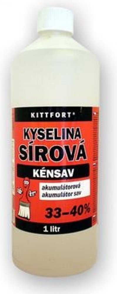 KITTFORT KYSELINA SÍROVÁ akumulátorová je základní chemická surovina pro všeobecně známé použití. Používá se jako elektrolyt do olověných akumulátorů, pro úpravu vody. Výhody Používá se jako elektrolyt Používá se k úpravě bazénové vody Pohlcuje vodní páry Využívá se v domácnostech, jako čistič odpadu Skladování Skladuje se v suchu při +5 °C až +25 °C a chraňte před přímým sluncem. První pomoc Pokud by došlo k podráždění kůže, je třeba kůži omýt velkým množstvím vody.Pokud by došlo k podráždění očí, je třeba okamžité vypláchnutí čistou vodou a poté fyziologickým roztokemPokud by došlo k problémům s dýcháním, je třeba se přemístit na čerstvý vzduch.Pokud by došlo k požití, je zapotřebí okamžitý výplach vodou a návštěva lékaře. Doporučené pracovní prostředky Nářadí pro aplikaci: rukavice Dostupné balení: 0,5 l, 1 l