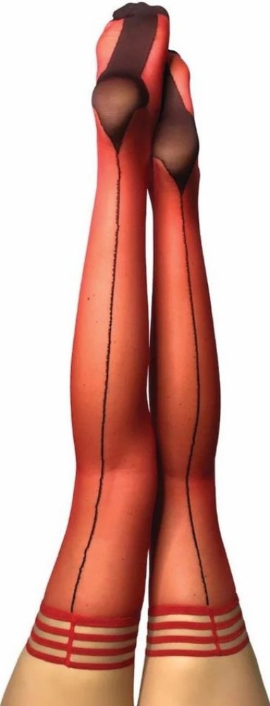 Naše červená průsvitná stehna s černým švem a kubánským podpatkem. Budete se cítit horko horko! Perfektní na dovolenou, ven nebo k pobytu. Stehenní stehna Monica se zadním švem jsou perfektním způsobem, jak vše okořenit, a skvěle se hodí k malým černým nebo červeným šatům. Stehenní nátělníky Kix'ies jsou navrženy pro celodenní nošení, s protiskluzovým úchopem. Nabízíme punčochy Petite až Plus Siz...