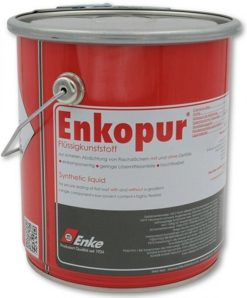 ENKOPUR je bezešvá, vysoce elastická, paropropustná a povětrnostním vlivům odolná hydroizolace, která je ve spojení s polyesterovou rohoží Enke dlouhodobě osvědčeným systémem k opracování detailů, vtoků, prostupů, světlíků, napojení se složitými tvary nebo pro místa se stojatou vodou jako jsou střešní žlaby. Vytváří v závislosti na teplotě a vzdušné vlhkosti velmi rychle ochrannou vrstvu, takže je rychle zajištěna odolnost proti dešti. Hydroizolační systém Enkopur je vhodný pro střechy s asfaltovým i fóliovým povrchem. Podklady z čerstvě ztvrdlého betonu nebo z cementové mazaniny musí být ošetřeny 2× pomocí penetrace UNIVERSAL VORANSTRICH 933, protože Enkopur je citlivý na zásadité látky. U starších betonových povrchů stačí zpravidla jedna vrstva penetrace, protože podklad není pískovitý resp. porézní. Při utěsňování balkónů, teras atd. je nutné především dbát na to, aby nebylo utěsnění vystaveno dlouhodobému mechanickému zatížení. V takovém případě je nutné nanést další vrstvu, která je odolná proti opotřebení (např. ENKETOP). Kromě toho je nutné dodržet, aby nebyla na povrch ošetřený Enkopurem položena dlažba bez vhodné dodatečné dělící vrstvy (není odolný proti zásaditým látkám, tedy cementovým lepidlům na dlažbu). Enkopur je jednosložkový, neředí se a je tedy ihned připravený ke zpracování.