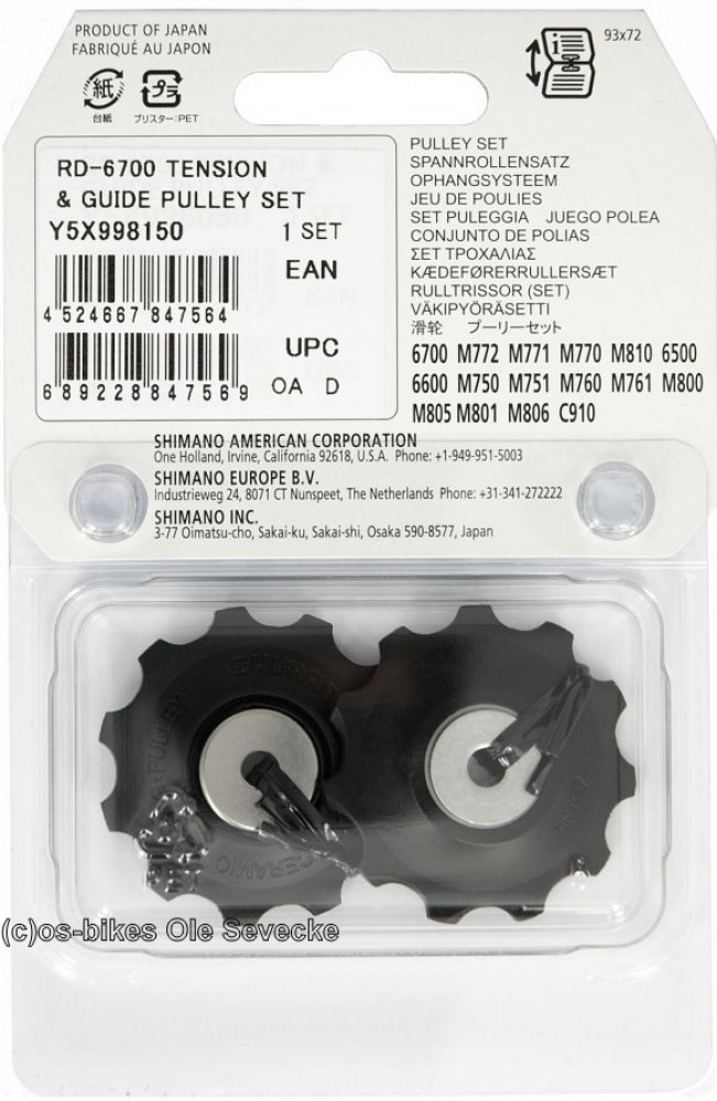 Y5X998150, kladky do přehazovačky Shimano 10 speed, napínací kladka - ložisko, vodící kladka - keramické pouzdro. Vhodné pro silniční i MTB přehazovačky RD 6770, 6700, 6600, 6500, M772, 771, 770, 761, 760, 751, 750, M810, 806, 805, 801, 800, T780Dají se použít i jako náhrada do přehazovačky Dura Ace 7800