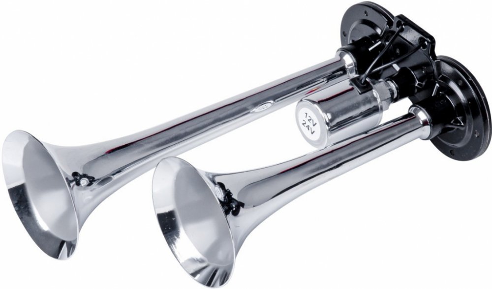 Vysoce kvalitní, dvojitá, profesionální, chromovaná, pneumatická fanfára vhodná pro 12V a 24V instalace. Fanfáru je třeba připojit ke kompresoru.