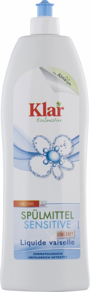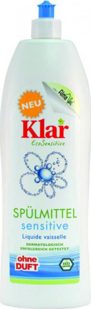 Prostředek na mytí nádobí KLAR Sensitive čistí nádobí přirozeně účinným způsobem. Jeho složení bez vůní bez námahy odstraňuje mastnotu a nečistoty, zanechává nádobí zářivě čisté a je obzvláště šetrné k vašim rukám. Koncentrát by se měl používat s mírou. Chrání tak životní prostředí i vaši peněženku.