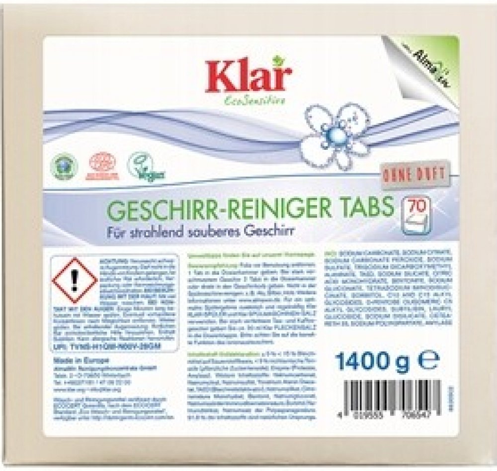 70 ks tablety Klar pro silné znečištění a mastnotu pouze detergent bez vůně 1.4 kg bez fosfátů, biologicky rozložitelné, obal z FSC