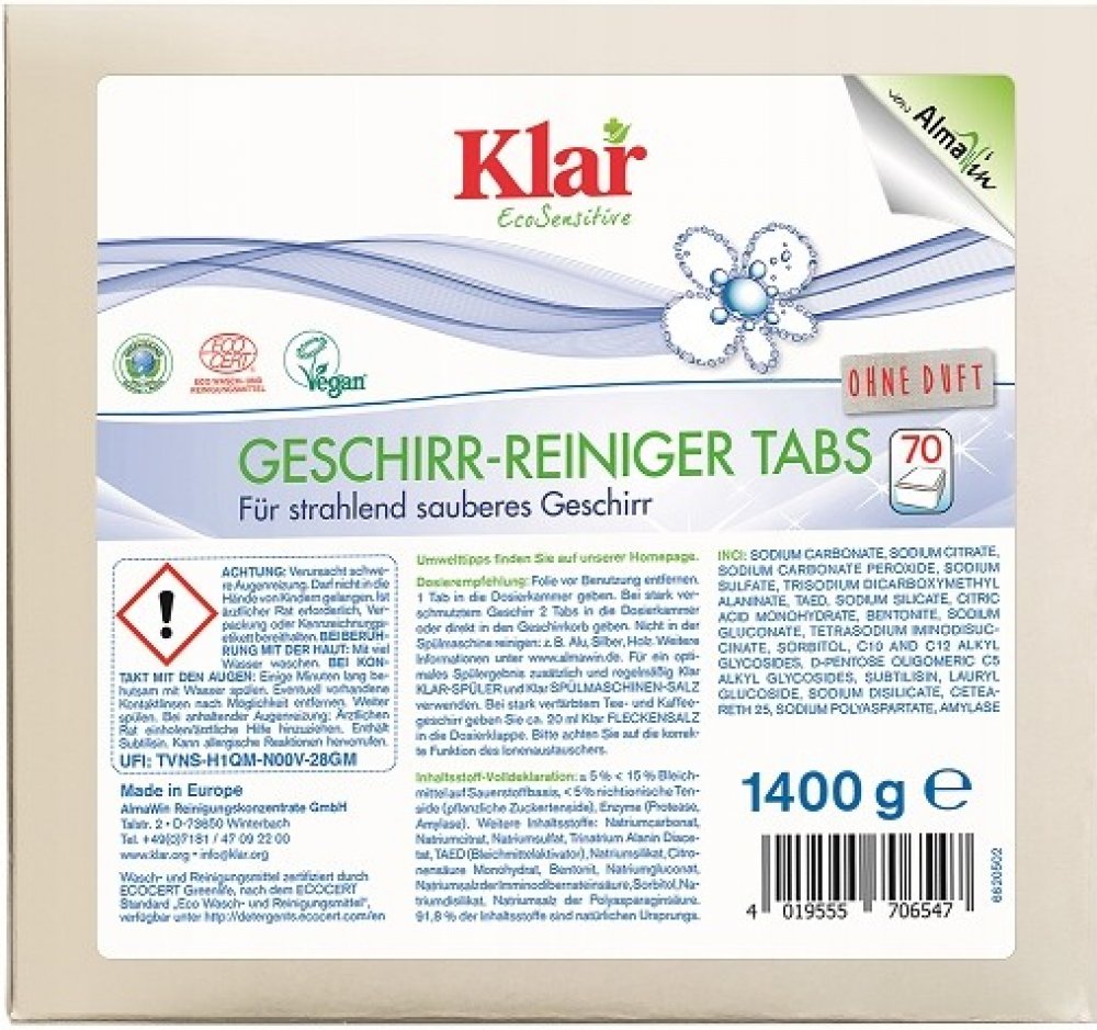 Nemyjte v myčce nádobí a kuchyňské doplňky vyrobené např. s hliníkem, stříbra, dřeva. Pro dosažení nejlepšího efektu je třeba navíc používat leštidlo do myčky nádobí Klar a sůl do myčky nádobí Klar. Pro odstranění usazenin z čaje a kávy je třeba přidat 20 ml odličovací soli Klar.