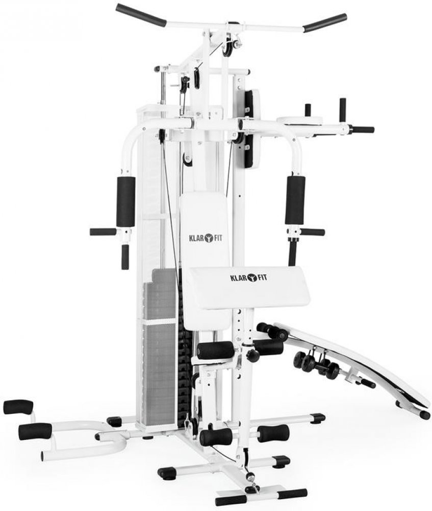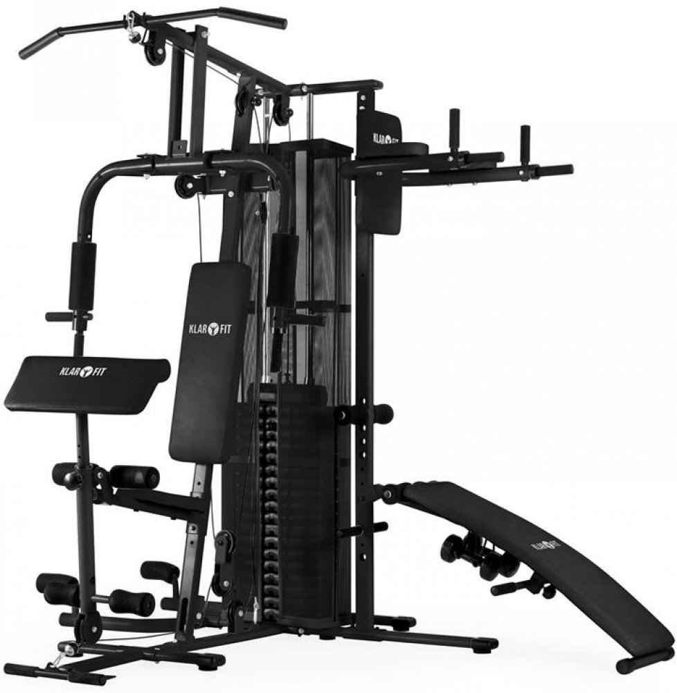 Zařízení Ultimate Gym 5000 od společnosti KLARFIT je spolehlivá silová tréninková stanice, která zajistí Váš každodenní trénink a umožňuje pro klouby šetrné provedení cvičení. Pevný trubkový rám s pohodlným polstrováním umožňuje více než 50 cviků pro celé tělo. Zařízení tak nabízí mnoho různých příležitostí zocelit Vaše tělo v soukromé domácí tělocvičně. Hladce pohyblivé lanové kladky zaručují rovnoměrné pohyby při optimálním přenosu síly. Z prostředního sedadla máte přístup k butterfly modulu, který může být také použit pro bench-press na trénink hrudníku a ramen, jako zařízení na natahování nohou pro přední svaly na nohou a širokou horní tyč lze využít pro biceps, triceps, latissimus a cvičení zad. Lanové zařízení je vhodné pro biceps, triceps a cvičení zad ve stoje, veslovací cviky vsedě pro ramena, záda a paže nebo cvičení nohou, když je namontováno poutko na nohy. Zařízení na ohýbání nohou lze použít pro zadní část nohou a zadek. Na pravé straně je šikmá crunch lavice pro cvičení břicha, podpůrný modul pro zvedací cvičení nohou a visící cvičení s odporem. Přízemní zařízení s odporem na levé straně je optimální pro různé varianty kliků vleže. Opěradlo i sedadlo je potažené snadno čistitelnou syntetickou kůží, a proto je možné jednoduše je po tréninku otřít ručníkem.