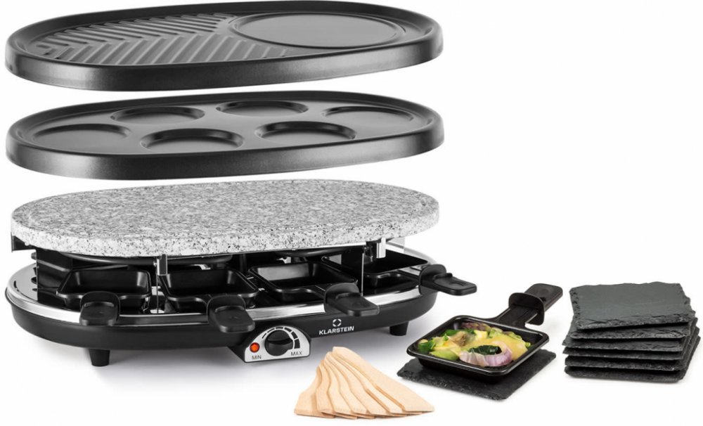 RACLETTE PARTY: Klarstein All-U-Can-Grill nastavuje nové standardy pro milovníky grilování. Pod horkou grilovací deskou o výkonu 1500 W a plynulou regulací teploty je prostor pro osm pánví na smažení, gratinování a tání sýra a mnoho dalšího. MULTITALENT: Horký přírodní žulový kámen na tomto raclettu grilu umožňuje 8 lidem opékat maso, ryby nebo zeleninu bez přidání oleje, což znamená, že taková příprava na raclettu zařízení je mimořádně nízkokalorická a zdravá. ÚČINNOST: Další výhodou povrchu raclette grilu z přírodního kamene je mimořádně ekologická absorpce a udržování tepla, takže na něm můžete grilovat ještě dlouho po vypnutí tohoto stolního grilu bez další spotřeby energie. ROBUSTNÍ: Nemusíte se bát, v jakém stavu je kámen a zda neopatrný host nepoškrábe povrch grilu. Můžete na něm bezpečně řezat nožem, aniž byste ho poškodili. Navíc je chuťově zcela neutrální. SNADNÁ ÚDRŽBA: Aby zábava pokračovala i po jídle, jsou všechny pánve opatřeny nepřilnavým povrchem, který výrazně usnadňuje čištění, a přírodní kámen snadno odolává intenzivnímu drhnutí. Top vlastnosti: Zábava na party: Raclette gril a hrnec na fondue až pro 8 osob Kombinace 4 v 1: Raclette, gril, palačinkovač a lívanečník Snadné použití:Plynule nastavitelný termostat Vysoká kvalita: topidlo z nerezavějící oceli Hot & Tasty:Kovová grilovací deska a přírodní kámen na maso, ryby, zeleninu a další Hodujte jako na Silvestra: s grilem All-U-Can Raclette můžete potěšit 8 úst najednou těmi nejlepšími pochoutkami pro každou příležitost. Ať už se jedná o klasické raclette hody, delikátně grilované maso a zeleninu, palačinky nebo sladké lívance - tento raclette elektrický gril vám nabízí to, co slibuje jeho název: All-U-Can-Grill. Chuťově neutrální deska z přírodního kamene umožňuje grilovat bez tuku a lze ji snadno vyměnit za předem připravené desky z lehkého kovu na palačinky, lívance a běžné grilování. Topné spirály s výkonem až 1500 W slibují vždy dokonalý výsledek grilování.Užijte si skvělé večery v příjemné společnosti: kolem exkluzivního Klarstein All-U-Can-Grill Raclette grilu může sedět až 8 osob a díky 8 pánvičkám, podložkám a dřevěným špachtlím, které jsou součástí balení, si užít maximální pohodlí při hodování. Praktické podložky z ušlechtilé břidlice dodávají zvláštní nádech. Detaily produktu: Vypínač s otočným ovladačem výkonuPánevní jamky v plechu na pečeníLehká kovová deska s lívancovými jamkamiLehká kovová deska ve tvaru krempy s drážkami pro grilováníDíky nepřilnavé povrchové úpravě se nic nepřipalujeSnadné čištěníChuťově neutrální deska z přírodního kameneOválný tvar: ideální pro střed stoluDřevěná stěrka pro snadné otáčení a mícháníProtiskluzové gumové nožičkyÚchyty Cool-Touch na zařízení pro snadné přemístění8 x raclette pánevVelmi stylové břidlicové podložkyVšechny pánve s rukojeťmi Cool-Touch pro snadnou manipulaciNapájení: 220 – 240 V | 50/60 Hz Obsah zásilky: 1 x zařízení8 x raclette pánev8 x podložka8 x dřevěná špachtle1 x lehký kovový talíř na palačinky1 x lehký kovový talíř na Crêpes1 x deska z přírodního kameneManuál v několika jazycích Rozměry: Rozměry zařízení: cca 45 x 14 x 27 cm (Š x V x H)Rozměry pánve na raclette (s rukojetí): cca 9 x 1,5 x 18 cm (Š x V x H)Rozměry jedné podložky: cca 10 x 0,5 x 10 cm (Š x V x H)Rozměry jedné dřevěné špachtle: cca 3,5 x 0,5 x 13,5 cm (Š x V x H)Délka kabelu: přibližně 110 cmhmotnost: cca 9 kg Produktové číslo: 10039923
