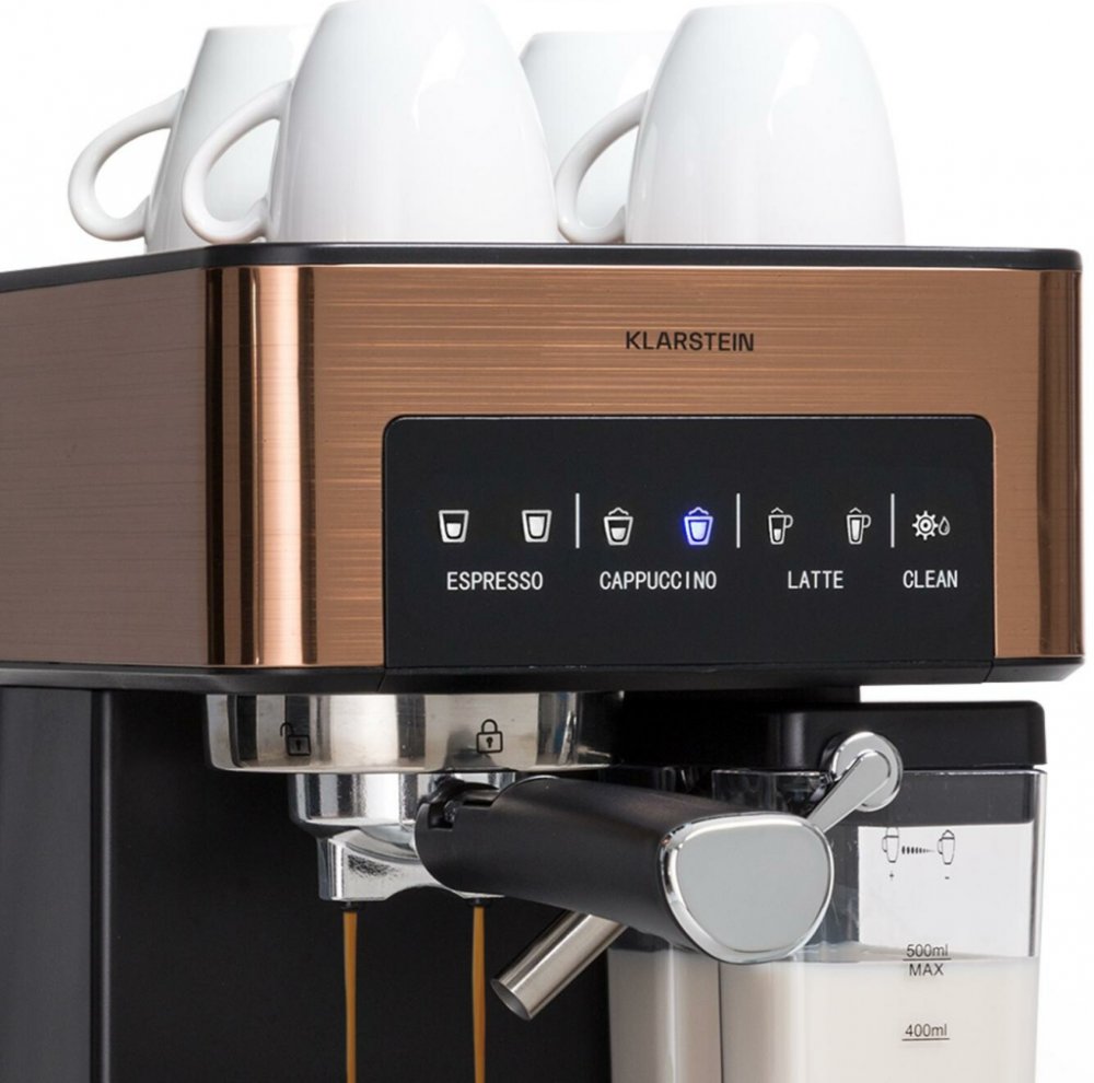 Klarstein 1 jedna parní tryska elektrické stříbrné velká 3 1.8 l vyjímatelná nádrž manuální 2.0 1350 W 20 bar 4.5 kg 210 × 400 × 310 s vyústěním dvojitá výpusť
