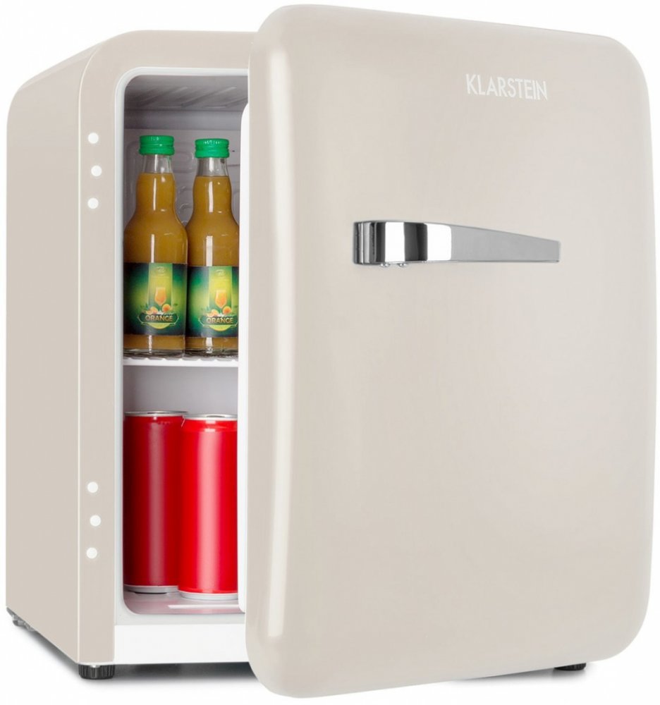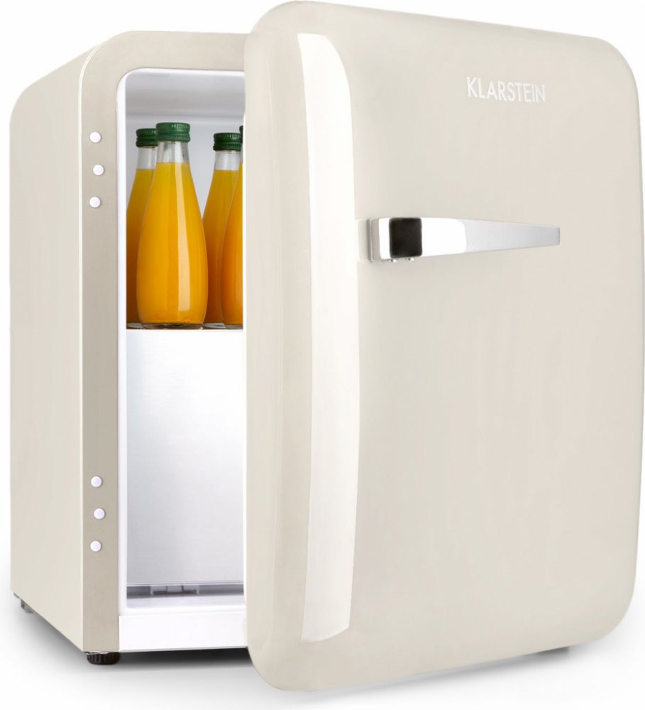 Ledové osvěžení, příjemné na pohled: Extravagantní lednice Klarstein Audrey Mini 2v1 Mini bar v retro designu je vaším nejlepším přítelem v horkých letních dnech. Ať už v kanceláři, ložnici, hotelovém pokoji nebo ve sklepě na večírku - Audrey se postará o osvěžující zmrzlinu nebo ledový nápoj! Minibar lze díky jeho kompaktním rozměrům umístit do jakékoli místnosti a zároveň v něm uchovat dostatek občerstvení a nápojů v chladu. K dispozici je chladicí prostor o objemu 32 litrů s držáky na lahve ve dveřích, které prostor ještě více rozšiřují. Kromě toho můžete v integrovaném mrazicím prostoru o objemu 5 litrů zmrazit drobné pokrmy a zmrzlinu až na -18 °C. Otočný ovladač teploty je neviditelně skrytý v zadní části chladničky, takže neruší jedinečný design vnitřně osvětlené mini chladničky .Americký způsob života: Barevný Retro-Minibar poskytuje malé osvěžení!