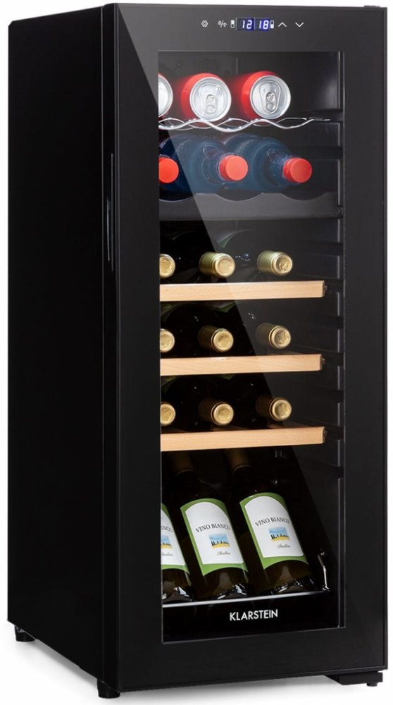 Dvě zóny pro každou chuť. Chladnička na nápoje Klarstein Bodega 18 Duo+ se svými dvěma chladícími zónami splňuje požadavky na vinotéku a chladničku na nápoje jednoduchým a kompaktním způsobem. Zatím, co jsou na spodních 3 dřevěných zásuvných policích uskladněny láhve s vínem, chladí se pivo, džusy nebo nápoje na obou horních policích s jednou kovovou zásuvnou policí. Obě zóny lze nastavit odděleně na teploty od 5 do 18 °C. O stylový pohled se starají panoramatické skleněná dvířka.Jednoduše plus k požitku: Vinotéka Klarstein Bodega 18 Duo+.