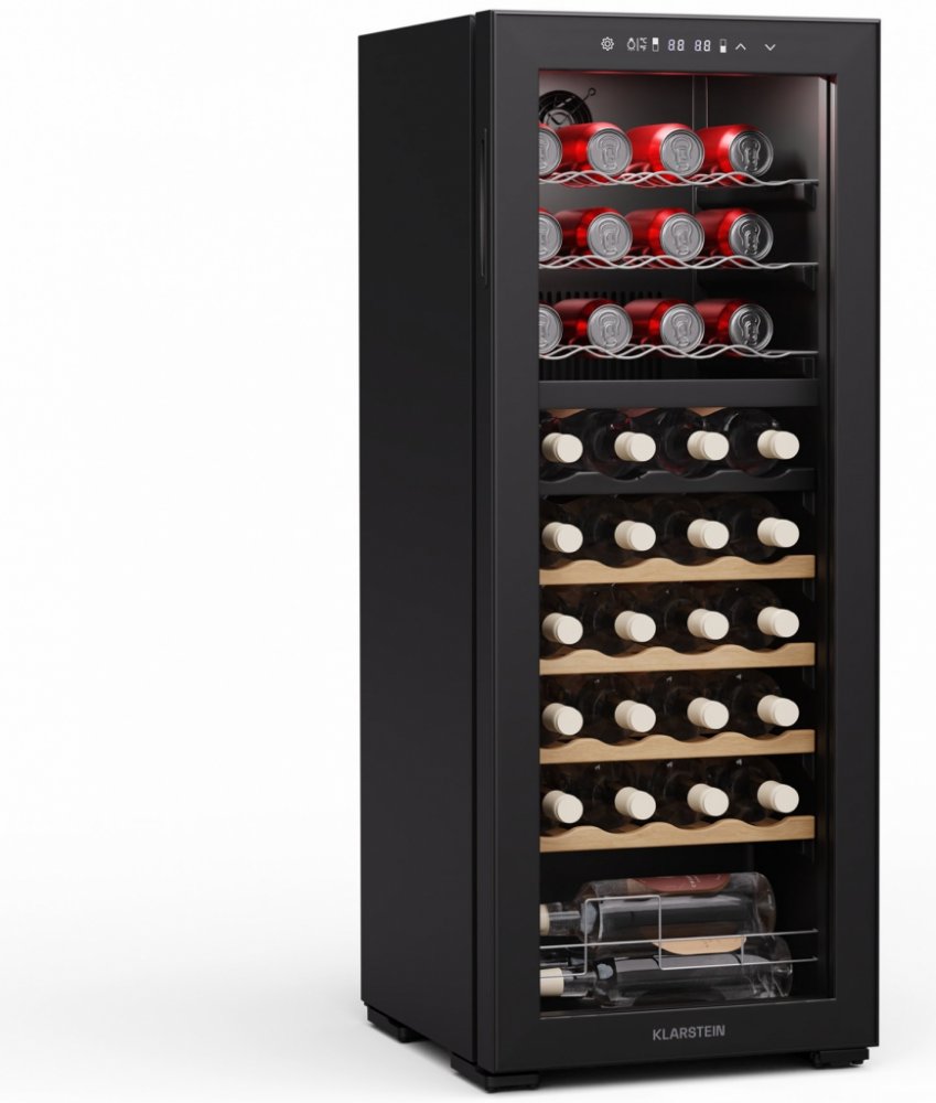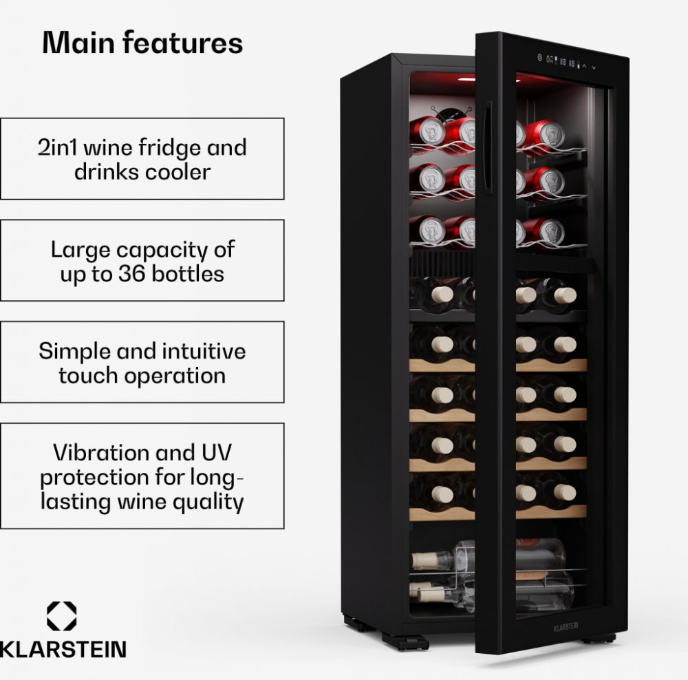 Top vlastnosti: Kapacita: 103 litrů až pro 36 lahví vína v chladicí zóně Hlučnost: provozní Hlučnost s hodnotou pouhých 39 dB Dvouzónová vinotéka: umožňuje nastavit různé teploty pro různé druhy vína a nápojů Ochrana proti vibracím a UV záření: Chrání vaše vína před vnějšími vlivy a zachovává jejich kvalitu LED osvětlení interiéru: stylové a energeticky úsporné osvětlení pro atraktivní prezentaci Zažijte optimální skladování vašich vín a nápojů s vinotékouKlarstein Bovella 36 Duo+. Díky odděleným chladicím zónám můžete současně skladovat červená, bílá i šumivá vína při ideální teplotě. Tato dvouzónová vinotéka je ideálním řešením pro každého milovníka vína.Chladnička na víno a nápojeKlarstein Bovella 36 Duo+ je všestranným pomocníkem do každé domácnosti. S objemem 103 litrů nabízí prostor až pro 36 lahví a je ideální pro skladování různých druhů vína i jiných nápojů. Dvě chladicí zóny umožňují skladování různých vín při jejich optimální teplotě v rozmezí od 5 do 18 °C. Elegantní design se stylovým vnitřním LED osvětlením a intuitivním dotykovým ovládacím panelem z ní činí ozdobu každé kuchyně nebo obývacího pokoje. Díky funkcím ochrany proti vibracím a UV záření zůstanou vaše vína uchována v té nejlepší kvalitě. Chladnička má tichý provoz s hlučností pouze 39 dB a lze ji flexibilně umístit jako volně stojící spotřebič.Ujistěte se, že je chladnička umístěna na rovném povrchu. Police pravidelně čistěte měkkým hadříkem a vyhýbejte se přímému slunečnímu záření.Zažijte dokonalé podmínky pro skladování svých vín a nápojů. Objednejte si chladničku na víno a nápojeKlarstein Bovella 36 Duo+ 2 v 1 ještě dnes! Detaily produktu: Intuitivní dotykové ovládání: Jednoduchý dotykový displej pro přesné nastavení teplotyOchrana proti vibracím a UV záření: Chrání vaše vína před vnějšími vlivy a zachovává jejich kvalituKapacita: 36 lahví / 103 litrů2 chladicí zóny4 dřevěné police a 3 pochromované kovové policeVolně stojícíProvozní hlučnost: 39 dBChlazení kompresorem pomocí R600aVnitřní LED osvětleníTeplotní rozsah zóny 1 a 2: 5-18 °CKapacita zóna 1: 16 lahvíKapacita zóna 2: 20 lahvíNapájení: 220-240 V | 50 Hz Obsah zásilky: Klarstein Bovella 36 Duo+ vinotéka a lednice na nápoje7 vyjímatelných policManuál ve více jazycích Rozměry: 43 x 110 x 48 cm (ŠxVxH)Hmotnost: 34,4 Produktové číslo: 10046241