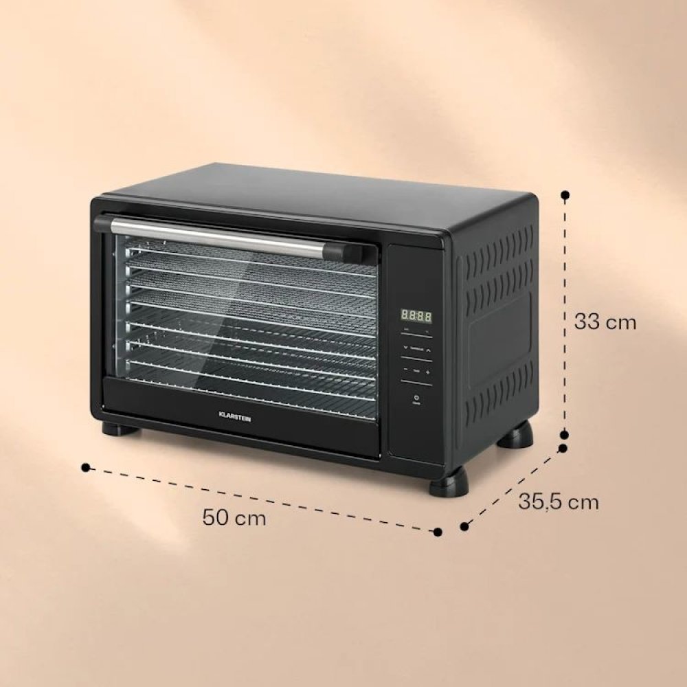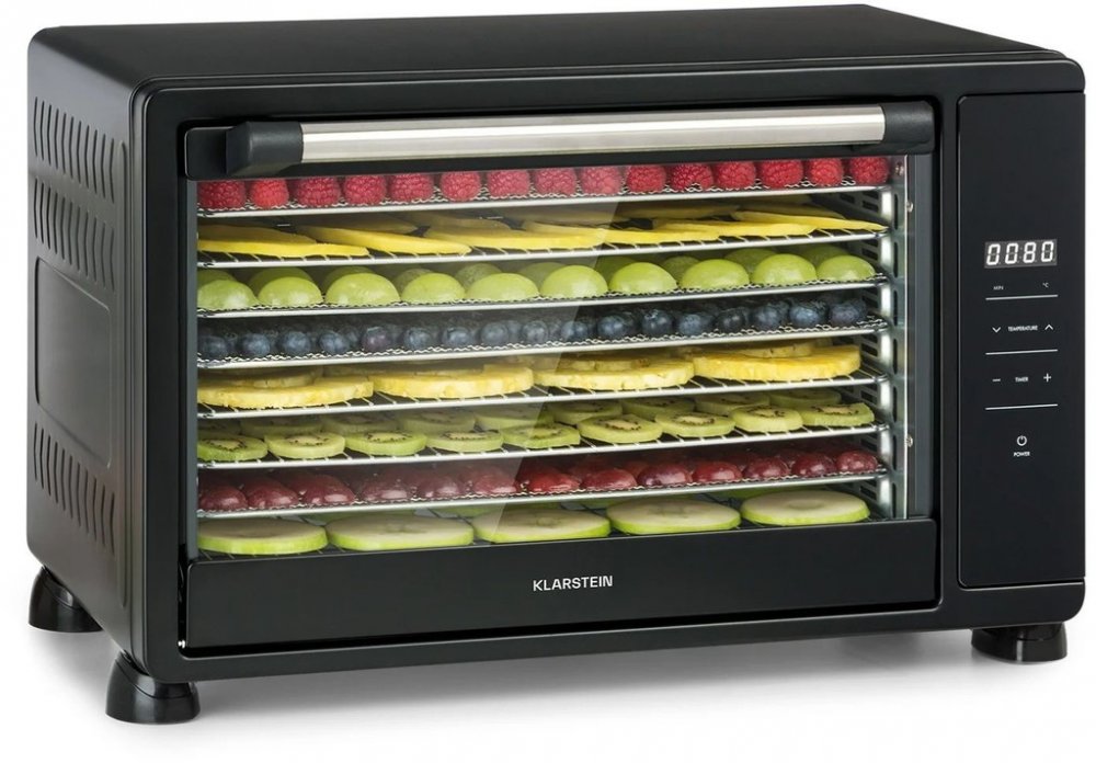 Připravte si zdravé a chutné pochoutky - s automatickou sušičkou Klarstein Mega Jerky si sami ve vlastní kuchyni jednoduše připravíte pochoutky na procházky, na sport, hobby nebo prostě na večerní chroupání.Výkonná automatická sušička Klarstein Mega Jerky vysuší ovoce, zeleninu, maso a jiné potraviny a připraví v rekordním tempu chutné a trvanlivé pochoutky a přísady. Zda sušené jablečné a banánové lupínky bohaté na vitaminy, zdravou zeleninu jako sušená rajčata, lupínky z červené řepy a kukuřice nebo okořeněné kousky sušeného masa - pro každou chuť má Mega Jerky vhodnou teplotu. Její 650 W silné topidlo z ušlechtilé oceli vytváří teplotu od 35 do 80 °C, a díky vnitřnímu konvektoru se systémem HotAir Circulation se rovnoměrně rozprostírá uvnitř sušičky. Na 8 poličkách s rozměry 38 x 26 cm lze sušit potraviny bez větší námahy. Pro správnou délku sušení je k dispozici časovač nastavitelný v 30 minutových krocích. Údržba automatické sušičky po ukončení sušení je velmi jednoduchá: pochromované kovové mřížky se dají jednoduše umýt. Vyjímatelný plech, který zachycuje kapající šťávu z ovoce a drobky lze jednoduše očistit. Kovové tělo s dvířky ze skla a dobře čitelnému dotykovému LCD displeji je díky elegantnímu designu okrasou v každé kuchyni.Pro zdravou stravu, bohatou na vitamíny: automatická sušička Mega Jerky od Klarstein!