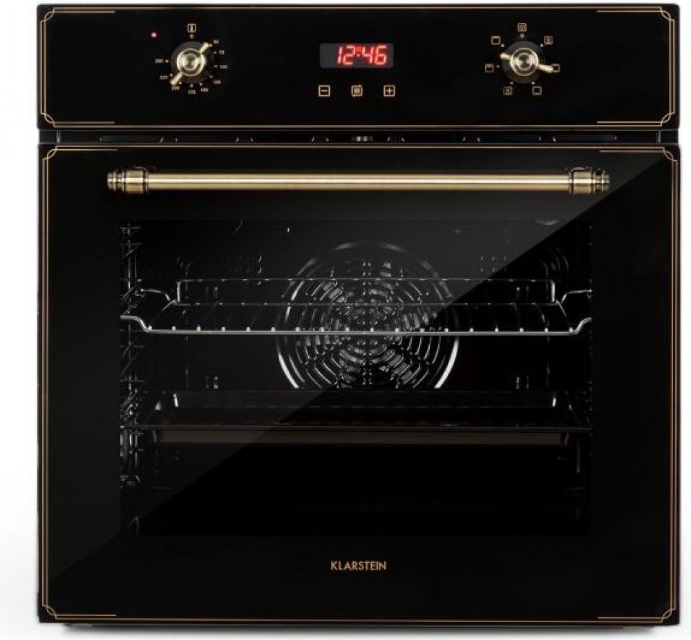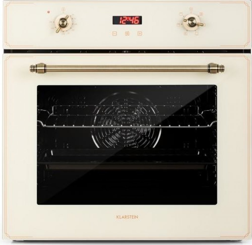 Čas na luxus: vestavná trouba Klarstein Elizabeth vizuálně kombinuje šarm 19. století s moderní technikou 21. století a Vaši kuchyni udělá okouzlující.S troubou Klarstein Elizabeth vnesete do své kuchyně čistý retro design. Otočné regulátory v mosazném designu, stejná rukojeť na dvířkách a zaoblené okénko trouby oživují kouzlo minulosti. Zařízení má kromě toho nejnovější funkce: s 2200 W a s třídou energetické účinnosti A připravuje šikovně a ekonomicky koláče, nákypy nebo pizzu ve svém velkém prostoru s kapacitou 70 litrů. Uvnitř lze zapnout cirkulující vzduch, horní a spodní ohřev, jakož i funkce grilu v 6 kombinacích. Zařízení splní všechny požadavky na nekomplikovaný a efektivní kuchyňský sporák. Vestavná trouba Elizabeth kromě toho nabízí snadno ovladatelný časovač vaření až do 10 hodin, volitelné teploty od 50 do 250 ° C a integrovaný digitální displej, který zobrazuje všechna nastavení.Se svým klasicko-krásným designem a mosazné zbarvenými prvky přináší elektrická trouba Elizabeth od společnosti Klarstein elegantní akcenty v retro stylu a upoutá pohled v každé kuchyni.