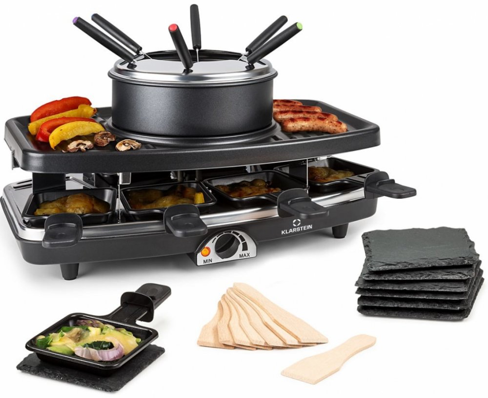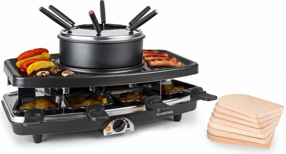 Spojuje, co k sobě patří: raclette gril Klarstein Entrecôte kombinuje v jednom zařízení dvě dokonalé možnosti chutného posezení při jídle: raclette a fondue. Kdo rád zve k sobě domů přátele nebo si rád vychutnává nekomplikovaný požitek z jídla s vlastní rodinou, ten ocení příjemné posezení u masového nebo sýrového fondue nebo raclette grilu. Stolní gril Entrecôte nabízí optimální vybavení pro rozmanité kulinářské události mezi vlastními čtyřmi stěnami až pro 8 osob.Kreativitě se nekladou hranice. Raclette pánvičky se dají naplnit vlastními výtvory a následně je lze připravit v raclette grilu. Zatímco se pohodlně připravují sýr, zelenina, maso a ryby, plyne rozhovor kolem stolu. Nad osmi pánvičkami lze díky grilovacímu nástavci opéct chléb jako přílohu nebo grilovat maso, ryby a zeleninu. Na pevné kamenné grilovací desce lze připravit zeleninu mimořádně šetrně a s nízkým obsahem tuku. Připravit se dají nejen slané dobroty, ale také sladké dezerty jako pečené banány nebo ananas s medem. Díky nepřilnavému povrchu lze delikatesy bez problémů odebrat z pánviček a grilovací desky. A abyste hned věděli, kam položit svou horkou pánvičku, tato sada obsahuje 8 elegantních podložek pod pánvičky z bukového dřeva.Namísto desky z přírodního kamene lze na grilovací nástavec položit hrnec na fondue. Lahodné sýrové dipy s chlebem, chutné masové fondue s vínem, olejem či vývarem nebo sladké čokoládové fondue s ovocem rozšíří kulinářské pochoutky, které stolní gril Klarstein Entrecôte dokáže připravit. Praktický kryt drží prázdné fondue vidličky v jejich poloze a zabraňuje zašpinění. Špízy jsou navíc barevně odlišeny pro rozpoznání.Topný výkon 1100 W se postará o rychlé rozehřátí raclette grilu, který lze plynule regulovat pomocí termostatu. Aby si nikdo na horkém zařízení Entrecôte od společnosti Klarstein nespálil prsty, všechny pánvičky a fondue vidličky jsou vybaveny tepelně izolovanými rukojeťmi. Po jídle usnadní čištění zařízení odnímatelné grilovací desky a fondue součásti. Takže dalšímu společnému a nekomplikovanému stolování s přáteli a rodinou nestojí nic v cestě.
