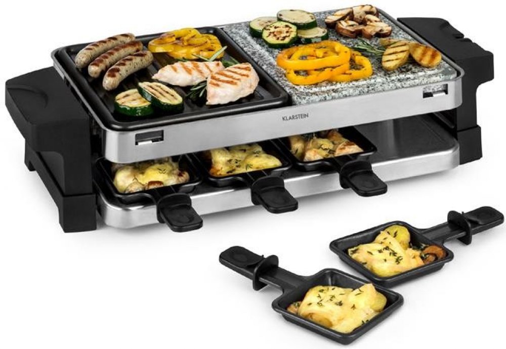 VÝKON: Raclette Gril Klarstein Sirloin 1500 W roztaví sýr, opeče maso a připraví zeleninu nebo houby v rekordním čase. Teplotu lze snadno regulovat pomocí termostatu. SMART: Díky konstrukci probíhá grilování na dvou úrovních dole a nahoře. Zatímco dole se 8 ocelových pánví s nepřilnavým povrchem používá ke gratinování sýra, nahoře jsou mezitím řádně zahřáté grilovací desky. SPOUSTA MÍSTA: K dispoz...