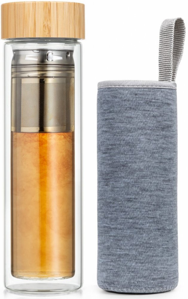 Stylová cestovní láhev na čaj: láhev na čaj Bambuswald s kvalitním bambusovým uzávěrem, odnímatelným sítkem a ochranným krytem je ideální společník, ať už do kanceláře, při sportování nebo na univerzitu.Štíhlá láhev ze skla odolného proti teplu a chladu a tak je vhodná na studené i teplé nápoje. Její dvojité sklo se s jeho izolačním účinkem stará o to, aby si nápoje dlouho udržely svou teplotu. Nerezové sítko na čaj dodává optimální požitek z čaje. Sypaný čaj dejte jednoduše do sítka a přelijte horkou vodou - a hotový je čerstvě zalitý čaj. Láhev Bambuswald můžete samozřejmě použít i na kávu nebo jiné nápoje. Bezpečný uzávěr se závitem je vyroben z udržitelného, rychle dorůstajícího bambusu. Díky přibalenému ochrannému krytu je nová láhev na čaj chráněna před nárazy a škrábanci.Tvarově pěkná, praktická a ekologická: užívejte si horké nebo studené nápoje - na cestách nebo doma - s lahví na čaj Bambuswald.
