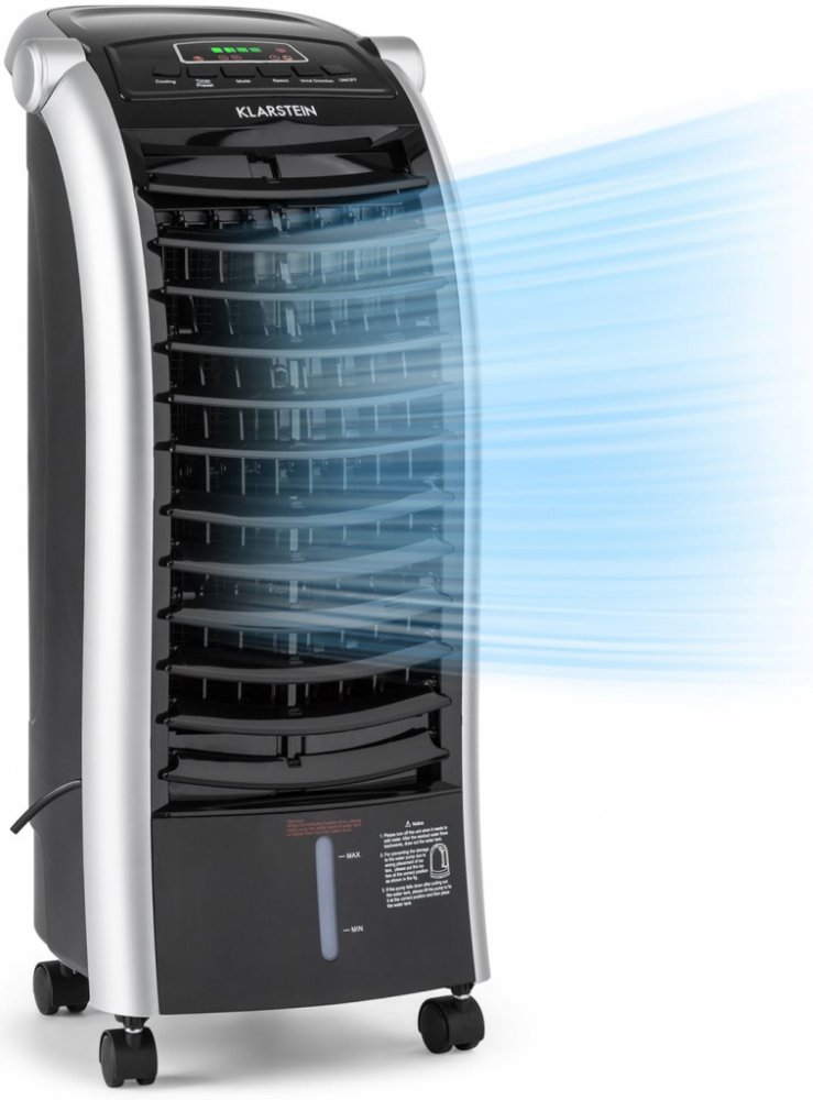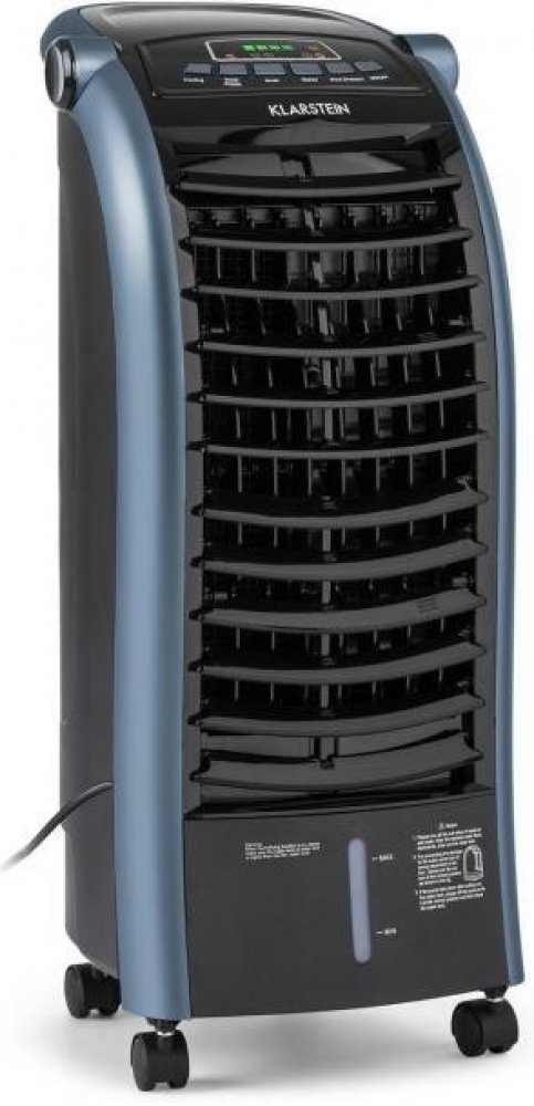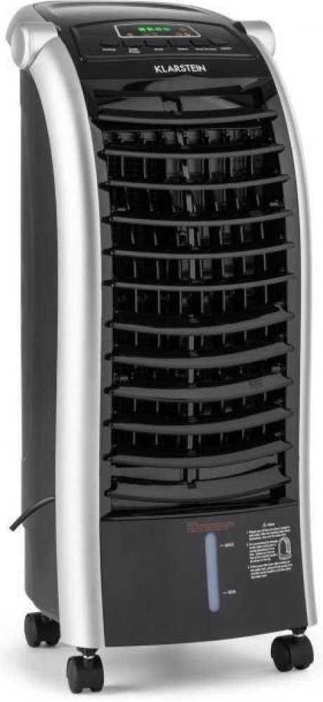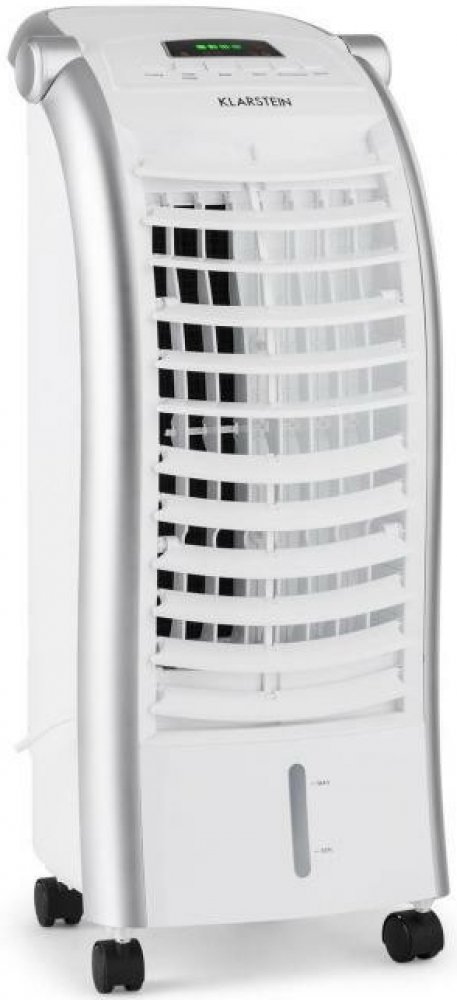 Maximální osvěžení! Klarstein Maxfresh přináší do místnosti v horkých letních dnech svěží, vychlazený vzduch. S ventilátorem, chladičem vzduchu a zvlhčovačem vzduchu pro osobní klimatickou oázu. Pomocí LED displeje s panelem se šesti funkčními tlačítky lze kombinované klimatizační zařízení nastavit zcela dle Vašeho přání. Obsluha probíhá intuitivně a rychle díky snadno pochopitelnému zobrazení se symboly. Tři úrovně výkonu a volitelně zapínatelná automatická funkce otáčení lamel umožňují přesné přizpůsobení každým klimatickým podmínkám, velikosti místnosti a rozmístění sezení. Kromě toho má zařízení Maxfresh k dispozici tři různé provozní režimy, jako například přírodní režim, při kterém proudí vzduch podobně jako při přirozeném zesílení a slábnutí větru. Chladné teploty a maximální pohodlí. Ke zlepšení účinku osvěžení má Klarstein Maxfresh i zapínatelný zvlhčovač vzduchu. V 6litrovém zásobníku vody se chladí a následně zvlhčuje přivedený vzduch. Kromě toho také díky svému integrovanému filtru odstraňuje ze vzduchu prach a nečistoty, takže i v největším letním horku lze svěže dýchat. Dva chladící sáčky mohou ještě snížit teplotu vody, a tím významně zvýšit účinnost chlazení. Praktická funkce časovače umožňuje pohodlné, časově řízené používání, které navíc šetří Vaši peněženku. Neomezeně dobré klima. Díky spodním kolečkům lze chladič vzduchu jednoduše a volně přesunovat po místnosti, je maximálně flexibilně použitelný. Umí přesvědčit nejen výkonem, ale je také designem, hodí se do jakéhokoliv interiéru. Tento design doplňuje moderní i klasické obývací a pracovní prostory. Vezměte prosím na vědomí, že se u tohoto zařízení nejedná o klimatizaci v tradičním smyslu, ale o chladič vzduchu. Chlazení foukaného vzduchu je dosaženo odpařováním vody / ledu z 6litrové vodní nádrže zařízení. Ochranná značka dodavatele: Klarstein Značka modelu dodavatele: 10029394 Maximální objemový průtok F: 7,4 m3 / min. Příkon ventilátoru P: 55,8 W Servisní poměr SV: 0,1 (m3 / min.) / W Příkon v pohotovostním režimu PSB: 0,5 W Hladina akustického výkonu ventilátoru LWA: 51 dB (A) Maximální rychlost proudění vzduchu c: 12,9 m / sec. Měrný standard pro určení servisního poměru: ISO 12759: 2010, EN 50564: 2011, EN 60704-2-7: 1998, EN 60704- 1: 2010 + A11: 2012 Kontaktní adresa pro další informace: Chal-Tec GmbH, Wallstraße 16, 10179 Berlin