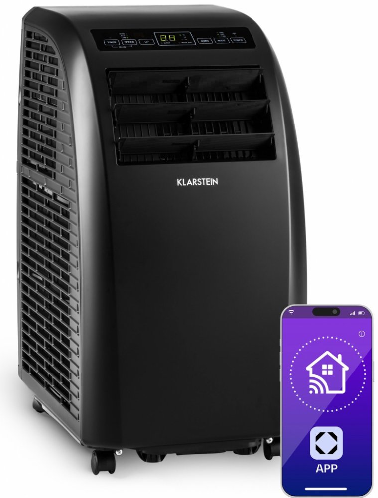 ULTIMÁTNÍ CHLAZENÍ 4 V 1: Naše mobilní klimatizace dává teplu zabrat díky 4 výkonným režimům: klimatizace, odvlhčovač, ventilátor a noční režim. Hladce se pohybující podlahová kolečka zajišťují plnou mobilitu. TICHÁ A VÝKONNÁ: Přenosná klimatizace má chladicí výkon 10 000 BTU / 3 kW a ochladí místnosti o rozloze 29 až 49 m². Malá klimatizace pracuje mimořádně ticho, takže každý může spát klidně. SNADNÁ INSTALACE: Naše mobilní klimatizace je vybavena snadno instalovatelnou výfukovou hadicí, která odvádí horký vzduch z místnosti. Instalace je snadná, stačí připojit klimatizaci k naší sadě těsnění oken. APLIKACE A DÁLKOVÉ OVLÁDÁNÍ: Inteligentní aplikace připojí klimatizaci k jakékoli domácnosti a umožní vám úplnou kontrolu prostřednictvím smartphonu. Pomocí dálkového ovladače můžete rychle zkontrolovat nebo změnit teplotu a další nastavení. UDRŽITELNÁ A ÚSPORNÁ: S touto energeticky účinnou klimatizací s třídou energetické účinnosti A a ekologickým chladivem R290 snížíte svou uhlíkovou stopu a účty za elektřinu. Top vlastnosti: Smart zařízení: Plně kompatibilní a ovladatelné pomocí Amazon Alexa a Google Home Katalogizace produktu podle obrázku s porovnáním výkonu zařízení: Portable AC Mobilní klimatizace s výkonem 10 000 BTU / 3 kW pro místnosti 29–49 m² a energetickou třídou A Dokonalé osvěžení:mobilní klimatizace pro regulaci vnitřní teploty Všestranná: 3stupňový integrovaný ventilátor pro lepší cirkulaci vzduchu Ideální teploty nejsou náhoda! Klimatizace Klarstein Metrobreeze Rom Smart ochladí v letních vedrech a přinese dovnitř přesně tu teplotu, při které se cítíš nejpříjemnější. Ať už v kanceláři, nebo doma: ochlazení je zaručeno.Více výkonu pro vysněnou klimu: s chladícím výkonem 10000 BTU/3,0 kW vytváří klimatizace Klarstein Metrobreeze Rom Smart příjemné teploty od 18 do 30 °C. Výkon přitom nemusí být drahý: klimatizace je taková úsporná, že si zasloužila třídu energetické účinnosti A+. Třístupňově nastavitelný ventilátor distribuuje ochlazený vzduch v místnosti jako jemný vánek nebo silný vítr a poskytuje další úlevu díky přísunu čerstvého vzduchu. A kdo chce pouze povzbudit cirkulaci vzduchu, může nechat samostatně pracovat ventilátor a ušetří tak spoustu elektřiny. Programovatelný časovač spustí nebo zastaví klimatizaci po uplynutí zvolené doby. Díky aplikaci Klarstein a připojení k síti WLAN je možné klimatizaci Klarstein Metrobreeze Rom Smart pohodlně ovládat pomocí smartphonu. Přehledný ovládací panel umožňuje zase jednoduché manuální ovládání. Dodávaný dálkový ovladač také nabízí možnost pohodlné obsluhy zařízení.Díky čistým liniím a elegantní černé konstrukci zapadne klimatizace Klarstein Metrobreeze Rom Smart do každého obytného nebo pracovního prostředí a tím si udrží suverénně a nenápadně své místo u okna. Součástí balení jsou samozřejmě všechny díly potřebné pro připojení klimatizace, jako jsou odpadní hadice, těsnění do okna a baterie do dálkového ovladače. Na jednoduché přemístění klimatizace obsahuje integrované, hladce pohyblivé kolečka.Léto může přijít! Ať je jakkoliv, venku zůstane horko a uvnitř příjemně. Protože mobilní klimatizace Klarstein Metrobreeze Rom Smart přináší do přehřátých místností ledově studené osvěžení a závan čerstvého vzduchu. Detaily produktu: chladící výkon: 10000 BTU/3,0 kWpříkon: 900 Wdoporučená velikost místnosti: 29-49 m²provozní hluk max.: 64 dBovládání pomocí aplikace prostřednictvím WiFi připojenízapnutí/vypnutí na horní straně zařízeníklimatizace v odsávacím režimu včetně odpadní hadice a souprav těsněníprovozní kontrolky v zapínací/vypínačichladicí prostředek: R2903 provozní režimy: chlazení, sušení a ventilátorrežim chlazení: standardní provoz na chlazení místností s teplotním rozsahem 18 až 30 °Crežim sušení: odstraňuje kondenzovanou vodu z klimatizaceventilátor: samostatná provoz ventilátoru bez chladícího výkonu3 stupně ventilace: vysoká, střední, nízká2 režimy časovače: časovač vypnutí & časovač zapnutíčasovač lze nastavit v půlhodinových krocích až do maximálně 3 hodin/v hodinových krocích mezi 3 až maximálně 24 hodinamirežim spánku: sníží rychlost ventilátoru na nízkou a po 7 hodinách zařízení vypneovládání pomocí ovládacího panelu v horní části zařízení s LCD displejem a provozními LED kontrolkamivšechny funkce je možné používat pomocí dálkového ovladačezobrazení teploty buď ve °C nebo °Fintegrované kolečka na snadné přemístěnínavíjení kabelu na zadní straně zařízeníokenní těsnění na výklopná okna je vhodné pro rozměry oken do 3,9 m (2 × výška okna + 1 × šířka okna