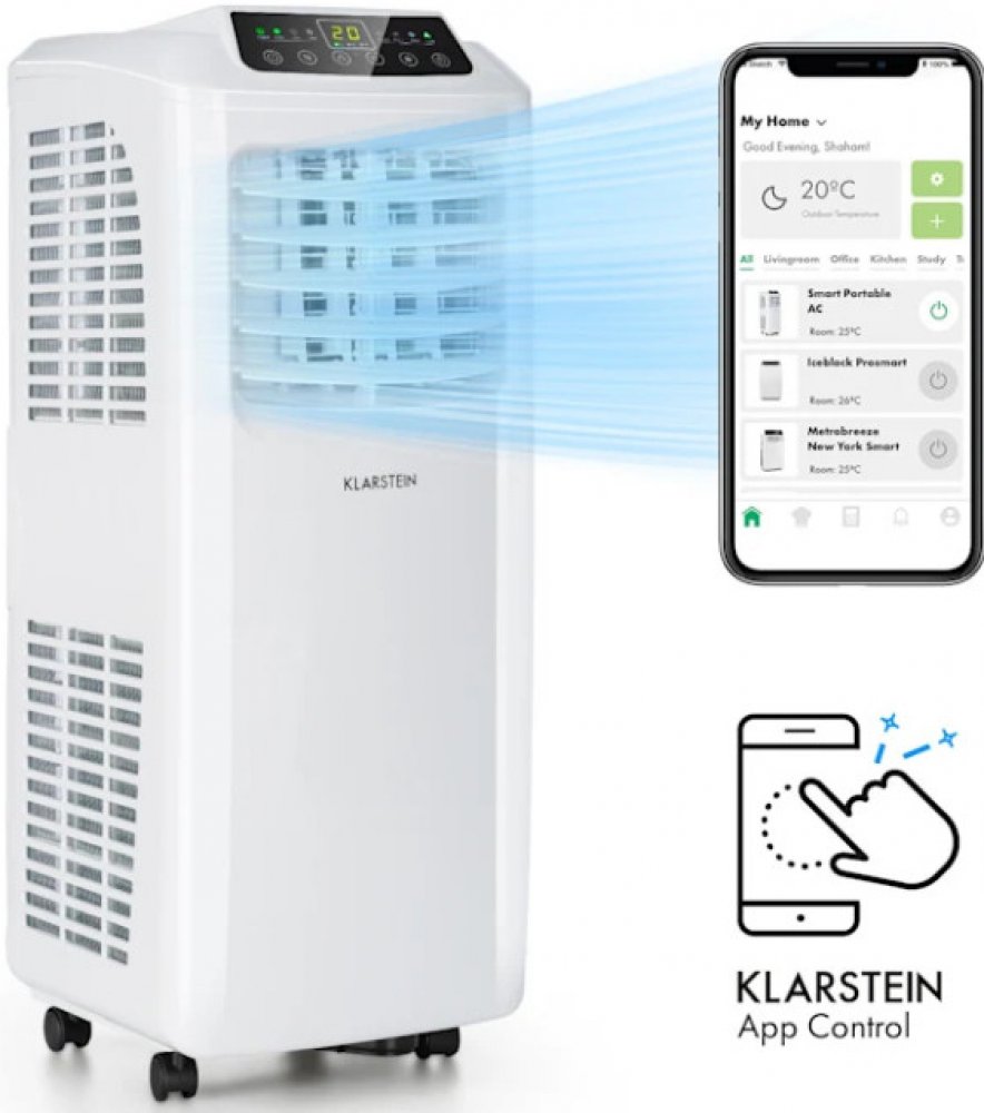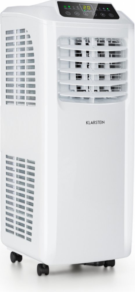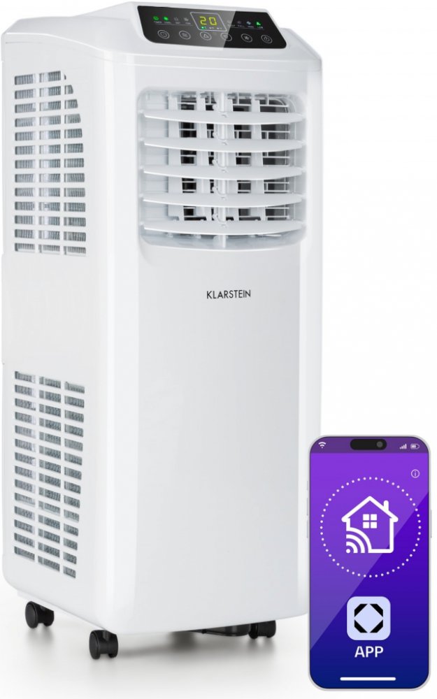 Mobilní klimatizace Klarstein Pure Blizzard Smart 9k se postará v horkých letních dnech o čistý a vychlazený vzduch v místnosti a díky ventilátoru a odvlhčovače vzduchu poskytuje vždy příjemné klima. Zařízení zaujme výkonným, ale přitom úsporným kompresorem na chlazení vzduchu. Chladicí výkon 9000 BTU/2,6 kW nebo odpovídající spotřeba energie 1010 W zajišťují zařízení Pure Blizzard Smart 9k třídu energetické účinnosti A a dělají z něj vhodné zařízení pro trvalý provoz do místností s velikostí od 26 do 44 m².Díky aplikaci Klarstein a připojení k síti WLAN je možné zařízení Pure Blizzard Smart 9k pohodlně ovládat pomocí smartphonu. Horní ovládací panel umožňuje zase jednoduché manuální ovládání. Teplotu prostor je možné libovolně zvolit v rozmezí 17-30 °C - podle upřednostnění o něco teplejší nebo chladnější teploty. Kromě chlazení se dá aktivovat ventilátor s dvěma rychlostmi pro optimální distribuci vzduchu v místnosti. Směr proudění se reguluje pomocí horizontálních a vertikálních lamel. Stejně lze zapnout odvlhčovač vzduchu, který rychle odvádí přebytečnou vodu z vlhkého vzduchu v místnosti a shromažďuje ji v integrované nádrži na vodu. Když je plná, odvlhčovač se deaktivuje a výstražná LED dioda upozorní na potřebné vyprázdnění.Funkci časovače klimatizace Klarstein lze použít tak, že se zařízení po stanoveném čase provozu samo vypne nebo zapne po uplynutí nastaveného času. Pure Blizzard Smart 7k můžeš naprogramovat tak, aby si po horkém dni v práci našel svůj byt v dobře temperovaném stavu, aniž si nechal celý den klimatizaci zapnutou. Všechny funkce můžeš pohodlně ovládat i pomocí dodaného dálkového ovladače.Díky pevně namontovaným kolečkům lze klimatizace jednoduše přesouvat, je tedy prostorově velmi variabilně použitelná.