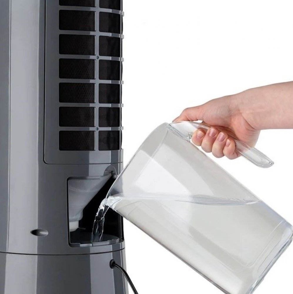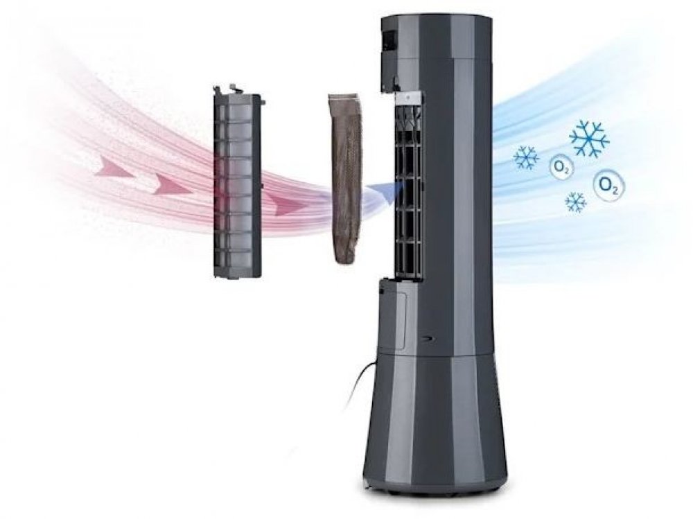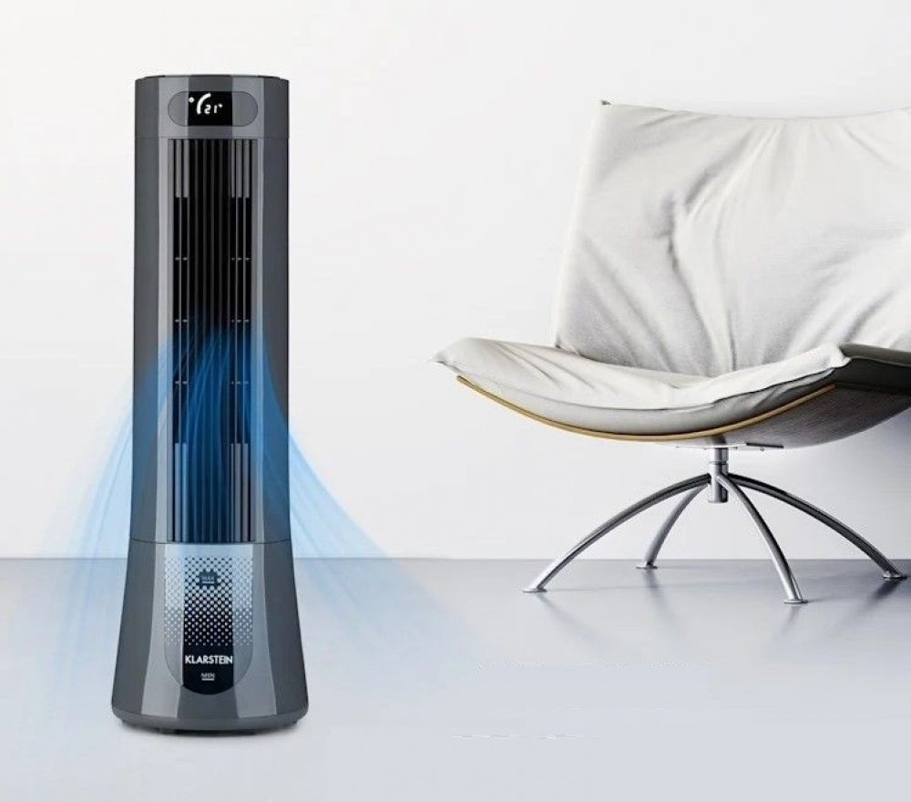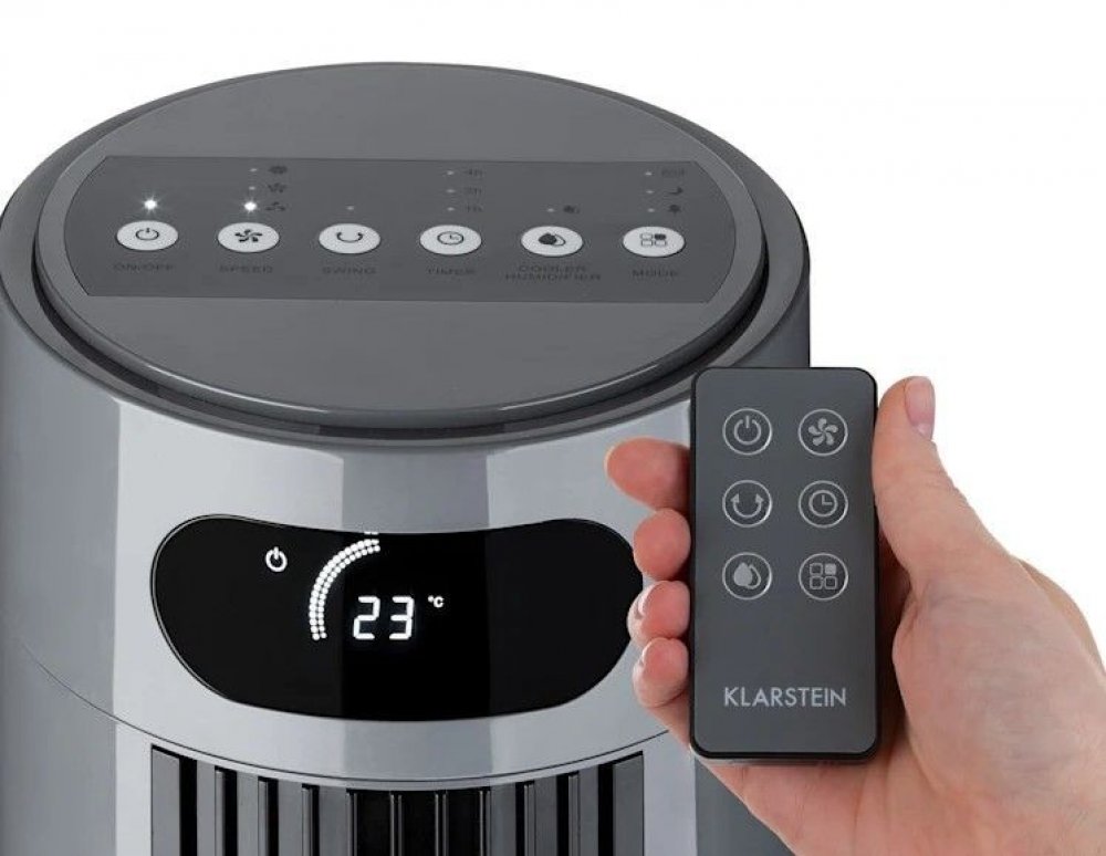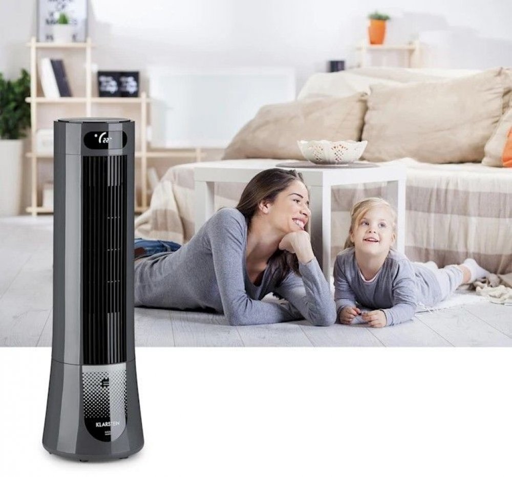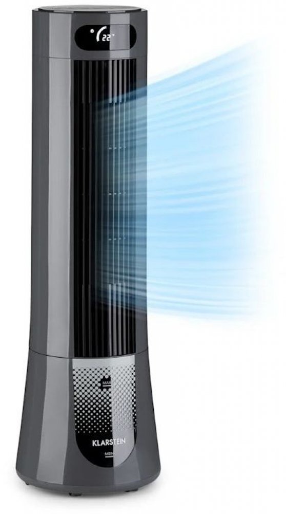 Čtyřnásobné osvěžení se stylovou větrací věží: ochlazovač vzduchu Klarstein Skyscraper Frost vám jako ventilátor, ochlazovač, čistič vzduchu a zvlhčovač vzduchu bude dodávat chladný vánek.Klarstein Skyscraper Frost: jako ventilátor rozhýbe vzduch se silným průtokem vzduchu 300 m3/h a vytvoří ve třech rychlostech příjemný vánek. Dodatečně můžete zvolit mezi přírodním větrem, nočním a ECO režimem. V kombinaci s funkcí ochlazování vzduchu, se vzduch dodatečně příjemně ochladí, a stará se tak o přesné osvěžení. Na to je voda ze 7litrové nádrže odpařována přes voštinový filtr. Takto je proudícímu vzduchu, přirozeným a šetrným způsobem, odebírána teplota – proud vzduchu se změní na příjemný chladný vánek a perfektně chladí, ať už jej postavíte na psací stůl, ke gauči nebo k posteli. Dva chladicí akumulátory ještě dodatečně snižují teplotu vody a postarají se tak ještě o více osvěžení. Klarstein Skyscraper Frost je proto nejen v létě vítán pomocník: jako zvlhčovač vzduchu v zimě vyzývá na souboj suchý vzduch z topení. Pokud byste chtěli osvěžit více než jen jednu osobu, můžete aktivovat jeho 90 ° oscilační funkci. O ještě kvalitnější vzduch se stará zabudovaný ionizátor, který ze vzduchu efektivně odstraní částečky prachu a zápachy. Díky skrytým posuvným kolečkům můžete ochlazovač Klarstein Skyscraper Frost kamkoliv přesouvat a ihned použít. Zařízení se ovládá přes dotykový panel na horní straně zařízení nebo zcela pohodlně pomocí dálkového ovládání. Výkonný a mnohostranný: ochlazovač vzduchu Klarstein Skyscraper Frost je osvěžující odpověď na všechny horké dny v roce. Klarstein Skyscraper Frost ochlazovač vzduchu, Šedá na Nej-ceny.cz