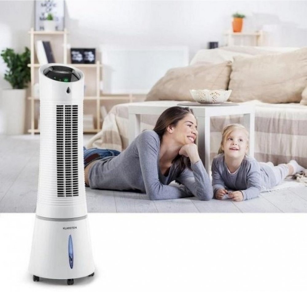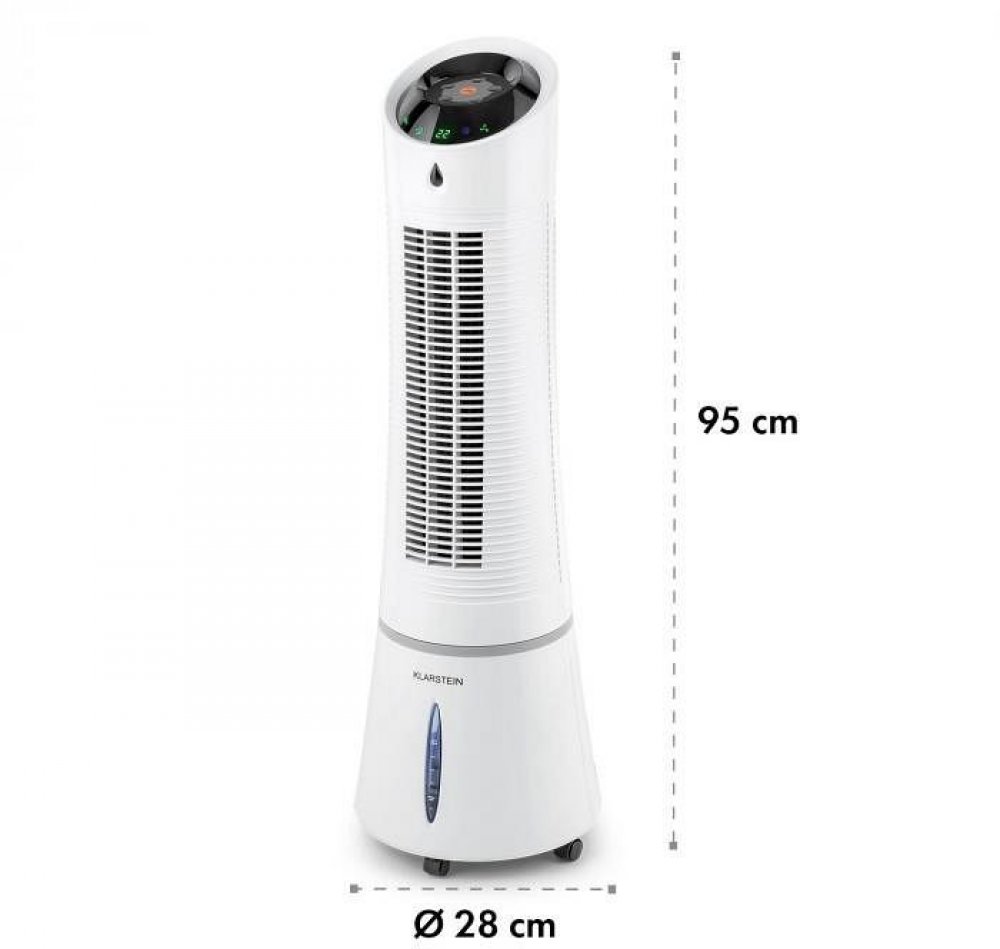 4 v 1 Skyscraper Ice od společnosti Klarstein vizuálně i výkonnostně převýší své kolegy a přináší do Vašich pokojů čerstvý vzduch. Osvěžující netradiční konstrukce je inspirována zářivě bílým mrakodrapem a již svým tvarem a barvou podpoří touhu po chladném, čerstvém vzduchu a jemném vánku. Prostorově úsporná věž ukrývá hned funkce tří zařízení, chytře sjednocuje ventilátor, chladič a zvlhčovač vzduchu. Ve svém nejširším místě měří ventilátor pouhých 28 cm a hodí se tedy i do malých zákoutí. Jeho moderní design jej ideálně začlení do prostor kanceláře nebo obývacího pokoje, ale je opticky dost neutrální i pro umístění v klasickém prostředí. Ventilátor vane čerstvý vzduch pro zajištění chlazení ve třech rychlostech. Přepínatelná oscilace umožňuje naklonit horní dvě třetiny zařízení Klarstein Skyscraper ve 180° zleva doprava a zpět. Tím se optimálně posune i vzduch ve větších prostorách. Pro splnění všech Vašich požadavků může být ventilátor přestavěn z normálního provozu na noční a přírodní režim. Během nočního režimu se ventilátor v 30 minutovém rytmu přepne na nejbližší nižší rychlost a nakonec se vypne, přírodní režim přidává a ubírá rychlost ventilátoru, což napodobuje přirozený vítr. Pro zlepšení osvěžujícího efektu má klimatizační zařízení také zapínatelný chladič vzduchu a zvlhčovač vzduchu. Přes 6litrovou nádrž na vodu se vzduch pomocí odpařování chladí a následně zvlhčuje. Dva dodávané chladící balíčky mohou teplotu vody dodatečně snížit, a tím významně zvýšit účinnost chlazení. Oba balíky plní svou funkci čtyři hodiny, potom musí načerpat znovu chlad v mrazničce. Kromě chlazení vzduchu má zařízení Skyscraper pro vzduch také ionizační/čistící funkci. Nasátý vzduch je nejprve filtrován pro odstranění částic prachu a nečistot, a poté je ionizován kvůli odstranění nepříjemných pachů jako cigaretový kouř a choroboplodných zárodků. Zařízení Klarstein je ovládáno buď šesti intuitivními tlačítky na horní straně zařízení, nebo docela pohodlně malým kulatým dálkovým ovládáním. Podsvícený displej zobrazuje ve srozumitelných piktogramech zvolená nastavení. Přes ovládací panel i pomocí dálkového ovládání lze naprogramovat časovač, který lze nastavit v půlhodinových intervalech, aby se po maximálně 7,5 hodině vypnul. Dostupné barvy: bílá Základní výhodou ochlazovače vzduchu v porovnání s tradičními klimatizačními zařízeními spočívá ve výjimečně nízké spotřebě energie. Kromě toho zařízení garantuje plnou mobilitu a žádné omezování - jelikož nevyžaduje instalaci odvádějící hadice jako klimatizace. Vezměte prosím na vědomí, že ochlazovač vzduchu nepředstavuje klasickou klimatizaci. Ochlazování vzduchu probíhá vypařováním vody/ledu ze zásobníku. Největší výhody: 4 v 1 zařízení: ventilátor/chladič vzduchu s dodatečným zvlhčováním vzduchu a funkcí čištění vzduchu Ekonomický provoz, příkon jen 45 W Průtok vzduchu 500 m³/h - ideální pro střední až velké místnosti Zapínatelná oscilace o 180° pro optimální provětrání prostoru 4 pevná instalovaná podlahová kolečka pro snadné přeložení Včetně dálkového ovládání pro pohodlné řízení Obsah zásilky: 1 x zařízení 2 x chladící balíček 1 x dálkové ovládání (vč. knoflíkové baterie) Manuál