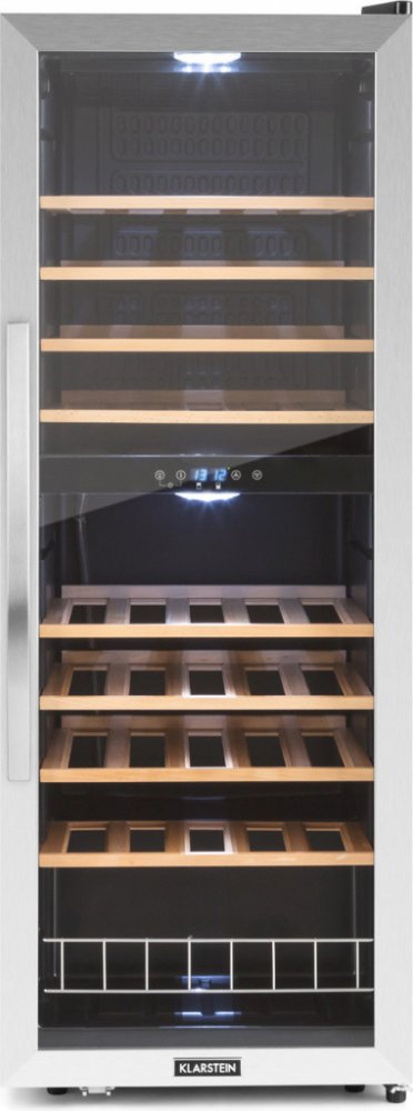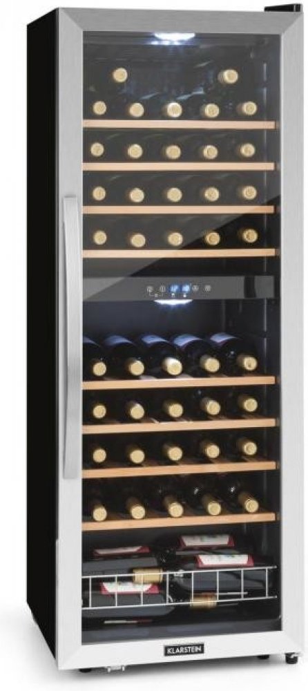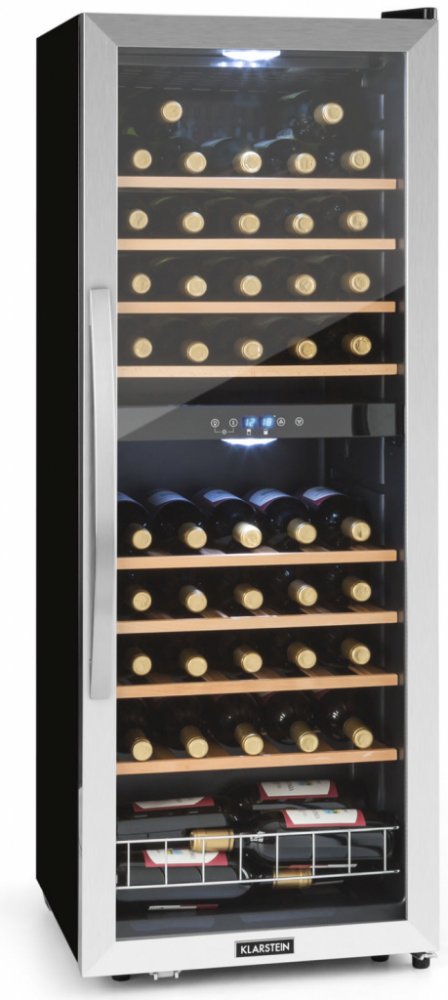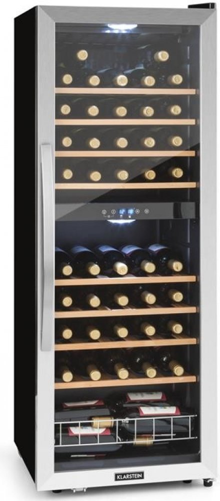Vinotéka Klarstein Vinamour 54D se postará o nejlepší požitek z vína, protože poskytuje současně správnou teplotu pro červená a bílá vína. Pro plné rozvinutí své chuti musí být víno vychlazené na správnou teplotu. S vinotékou Klarstein Vinamour 54D je to velmi jednoduché - v elegantním prostředí. Ve své horní a dolní chladicí zóně umístí až do 54 lahví vína; každá po 24 na dřevěných policích a dalších 6 lahví ve spodním oddíle. Teplota obou chladicích oblastí se nastavuje pomocí jednoduchého ovládacího panelu s LCD displejem. Lze tedy na přesnou teplotu chladit bílé, červené nebo růžové víno. O prezentaci vína se postarají prosklené přední dveře s rámem z ušlechtilé oceli. Přepínatelné vnitřní osvětlení uvádí na scénu skladované lahve. Díky tomu je stylovým prvkem nejen v domácí oblasti, ale také v barech a restauracích. Vinotéka Klarstein Vinamour 54D nabízí stylový skladovací prostor pro víno, sekty a jiné nápoje ve dvou chladicích zónách.