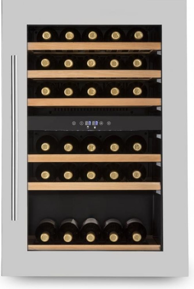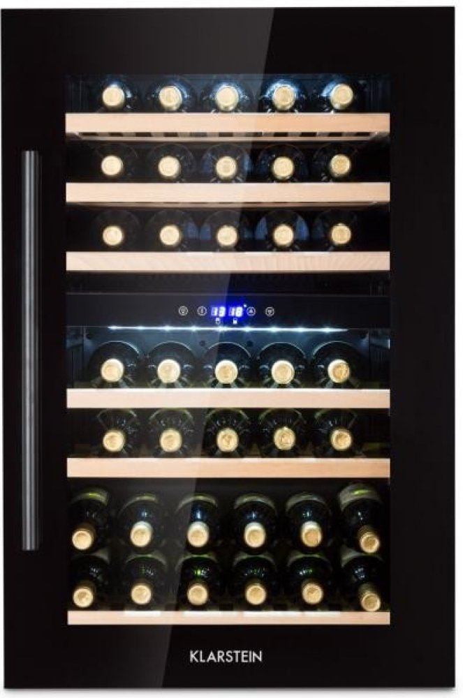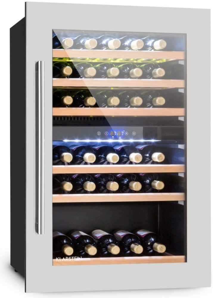 Chladnička na víno Klarstein Vinsider 35D rafinovaně uskladní až 41 lahví vína. S velkými dvojitými prosklenými panoramatickými dveřmi působí kalicí chladnička na víno nenuceně a elegantně. Ve spojení s důstojným vzhledem se zařízení uchází o exponované umístění v gastronomických zařízeních, vinotékách a na společenských akcích všeho druhu. S nastavitelným rozsahem teplot od 5 do 22 ° C lze podle obliby adekvátně uskladnit různé druhy vín, případně ji zaplnit jinými nápoji. Dvě nezávislé chladicí zóny umožňují adekvátní zacházení s různými druhy vína. Obsluha probíhá přes dotykový ovládací panel s podsvíceným zobrazením teploty ve stupních Fahrenheita nebo Celsia. Díky bílému LED osvětlení interiéru jsou skladovány vína prezentovány elegantně. Zařízení se dodává se šesti vyjímatelnými dřevěnými policemi, které umožňují flexibilní segmentaci zásob vína a umožňují rychlý přístup k různým vínům. Není skladování vína jako skladování vína. Chuť vína ovlivňuje mnoho faktorů - dva důležité faktory přitom představují teplota chlazení a skladování. Červené víno se servíruje zpravidla v rozmezí teploty mezi 12- 18 ° C, zatímco bílá a perlivá vína o pár stupňů chladnější. Různé chladicí zóny se však nedají nastavit v běžné chladničce, proto dokáže pomoci chladnička na víno. Chladnička na víno (známá také jako kalicí chladnička na víno) má nejméně dvě nezávislé chladicí části, pro které lze nastavit různé teploty. Takže se dají bez problémů skladovat láhve s bílým i červeným vínem a podle potřeby může pak rozvinout vybrané víno své celou aroma.Tvar lahví na víno ovlivňuje maximální objem a kapacitu vinotéky.