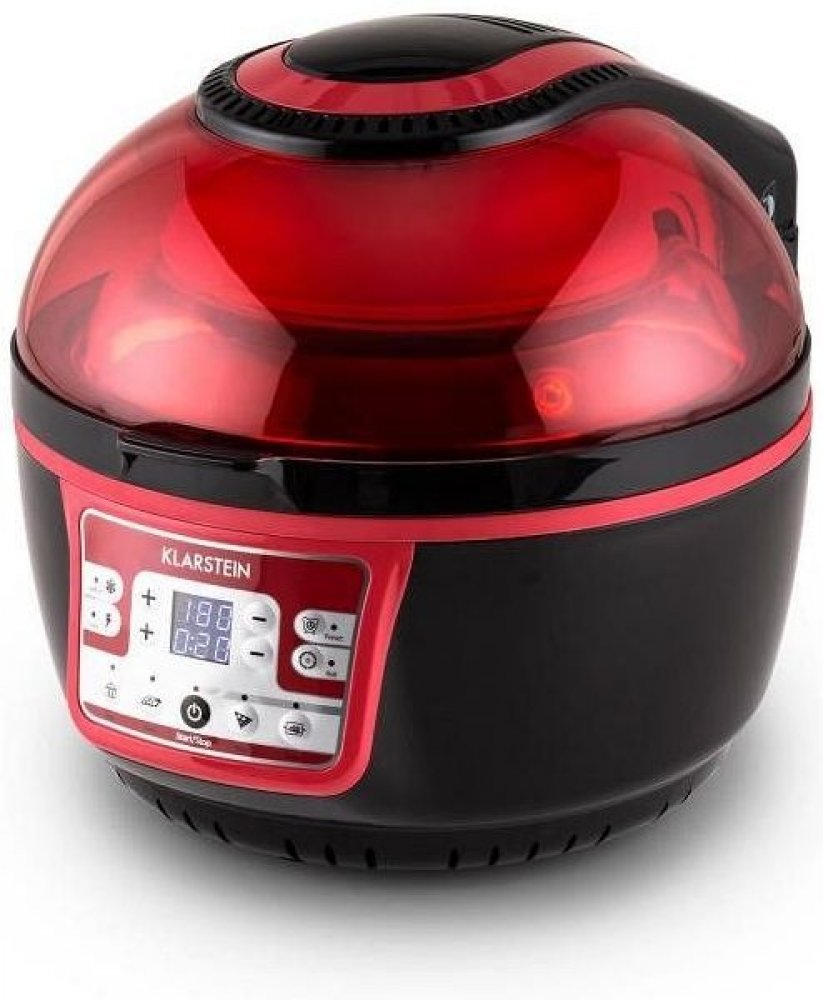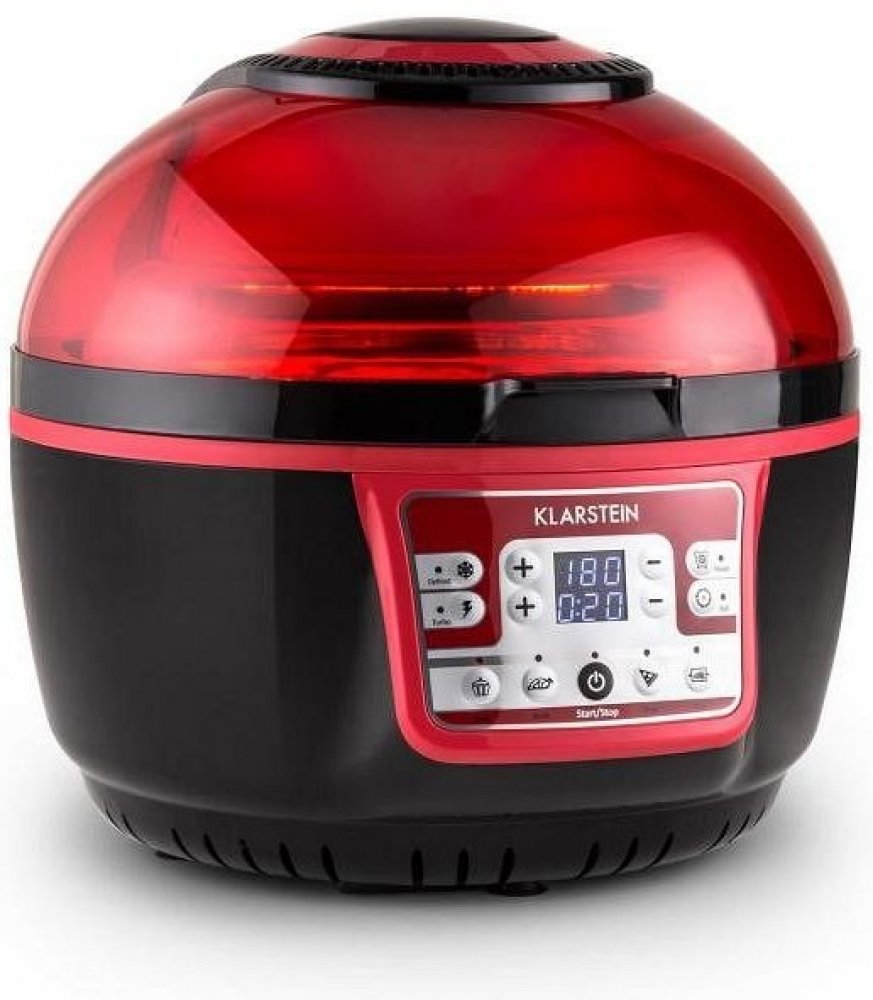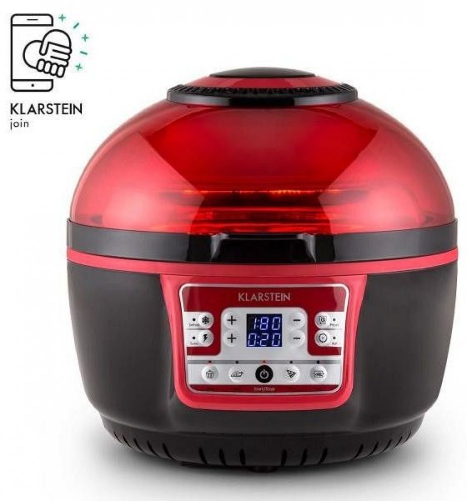 Klarstein VitAir je futuristicky působící horkovzdušná fritéza s inovativním přístupem ke klasickým kulinářským technikám, jako jsou fritování, grilování či pečení. Tento kuchyňský mistr spojuje všechny tyto postupy do jednoho multifunkčního zařízení. Pomocí halogenového infračerveného topného tělesa umožní rekordně rychlou a zdravou přípravu masa, ryb a zeleniny. Ať už vaříte z čerstvých nebo mražených surovin, jedno jídlo nebo kompletní menu, toto zařízení vám pomůže přichystat chutné menu bez přihřívání, rozmrazování a dodatečného přidávání oleje. Revoluční konstrukce a větrací technologie zaručují rovnoměrné působení tepla a zachování uvolňujících se šťáv. Výsledkem je téměř 60% úspora času, nevysušené jídlo a zachovaná šťavnatost a křupavost. Teplotu a délku přípravy je možné nastavovat manuálně, přičemž zařízení umožňuje využívání teploty v rozsahu od 50 do 230°C a maximálně hodinovou délku přípravy pro různé druhy přípravy. Navíc můžete využít i předprogramované programy určené k přípravě hranolků, grilovaného kuřete, koláčů, pizzy, steaků a šašliku. S funkcí časovače je možné samostatné spuštění přípravy v určeném čase, takže po probuzení na vás budou čekat čerstvé housky nebo hotová večeře po dlouhém dni v práci. Všechny funkce jsou řízeny pohodlně přes přední dotykový panel, přičemž LCD displej stále informuje o zvoleném programu, teplotě a době chodu. Součástí balení jsou různá příslušenství na využití všech funkcí zařízení Klarstein VitAir, díky kterému budete moci hranolky připravovat v praktickém 3D grilovacím koši, kuře nebo šašlik upevnit na horizontálně na rožeň. Zapínatelné otáčení umožňuje hranolkům a špízovým jídlům optimální propečení. Pro pizzu je zde samostatný plech, na grilování rošt pro přípravu steaků. Stylová oblá konstrukce zařízení vyrobená z dvoustěnného plastu je vybavena 310° panoramatickým průhledným okénkem pro sledování procesu přípravy. Díky nepřilnavému povrchu je minimalizovaná námaha při čištění a možné je i mytí v myčce nádobí. Díky kompaktním rozměrům si zařízení Klarstein VitAir najde své místo téměř v každé kuchyni, protože kombinuje několik kuchyňské zařízení. Se svou červeno-černou konstrukcí je halogenová trouba od společnosti Klarstein navíc příjemným poutačem pozornosti.