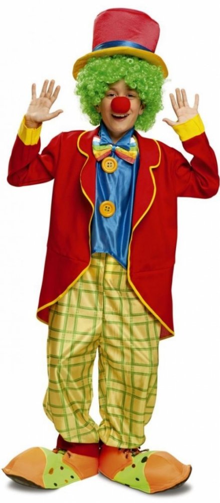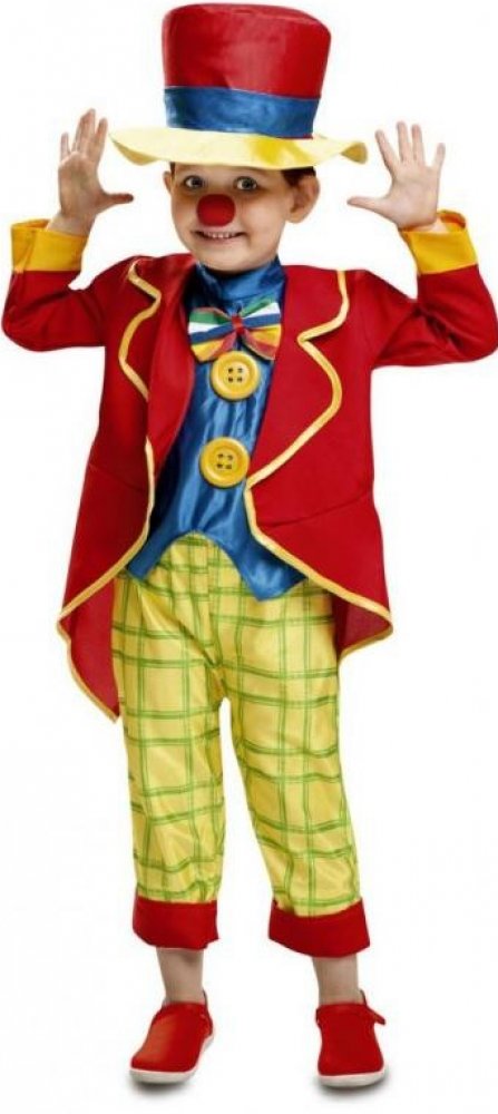 červenožlutý klobouk s modrou stuhou, červený žaket se žlutým lemováním a manžetami, kárované žlutozelené kalhoty s červeným spodním lemem na nohavicích, přední díl modré košile s barevným pruhovaným motýlkem a dvěma velkými žlutými knoflíky.