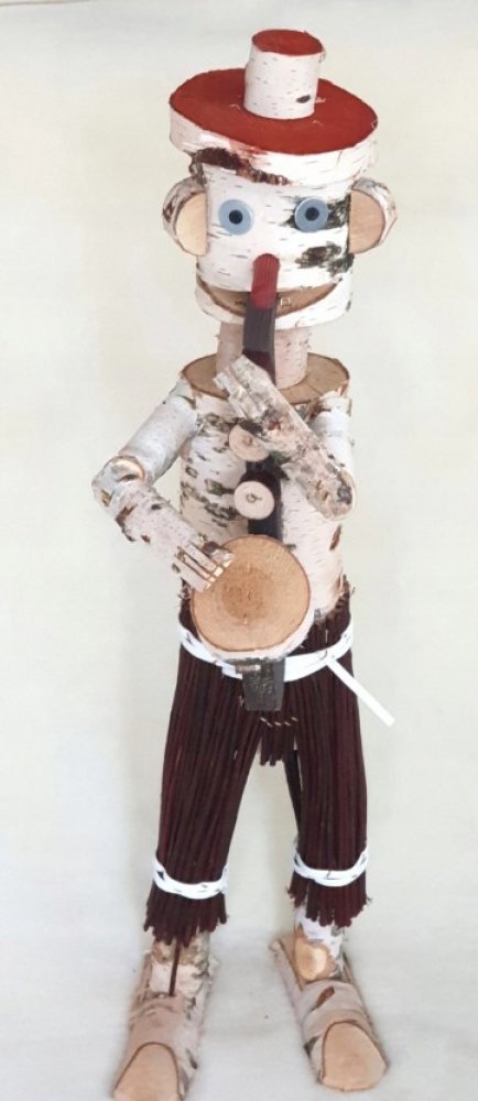 Krásná zahradní dekorace v podobě klauna na kole z břízy a proutí.