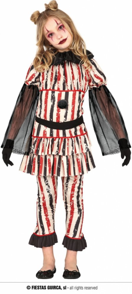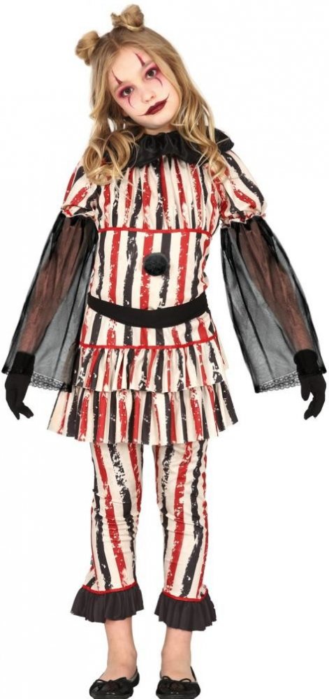 Hledáte super kostým HORROR klauna pro svou holčičku? Udělejte ji radost těmito dětskými klaunskými šaty. Bude se na každé Halloween párty nebo karnevalu bezpochyby všem líbit. Kostým obsahuje: šaty s nákrčníkem, kalhoty a opasek