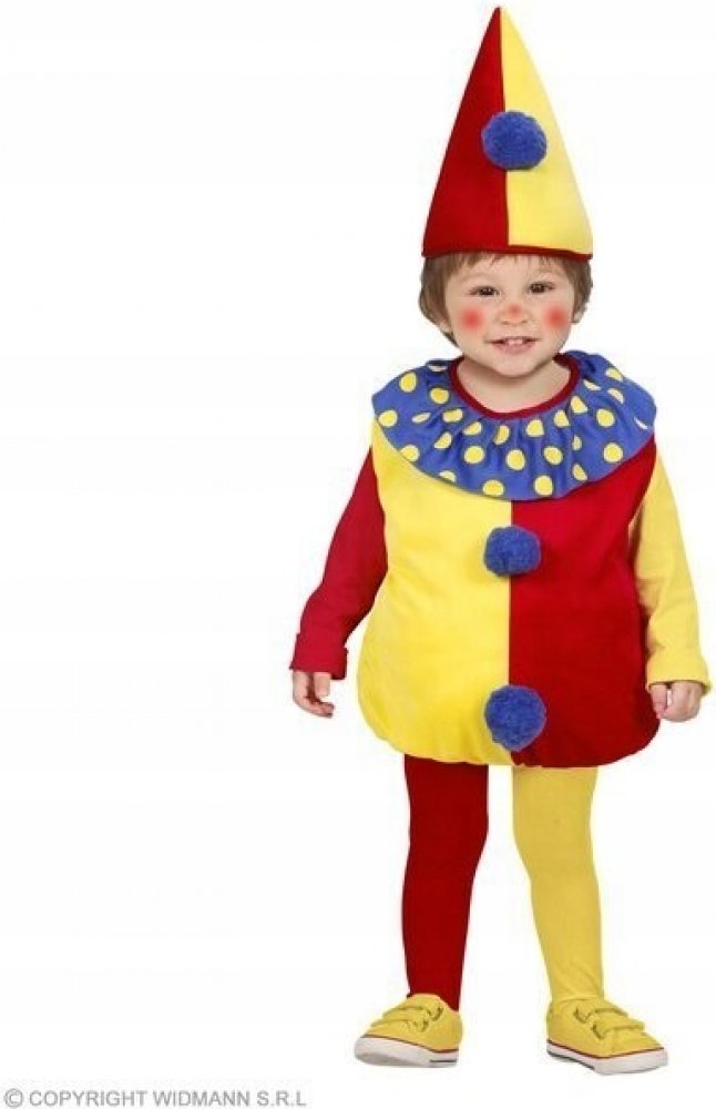 Kostým se skládá z vesty a čepičky. Červeno-žlutá barva s modrými bambulkami a puntíkovaným límečkem.
