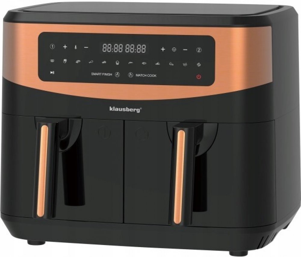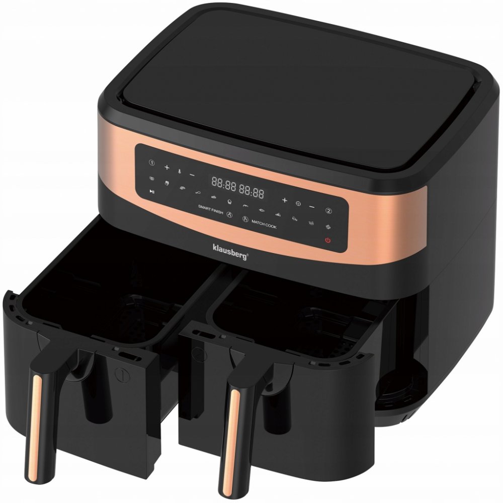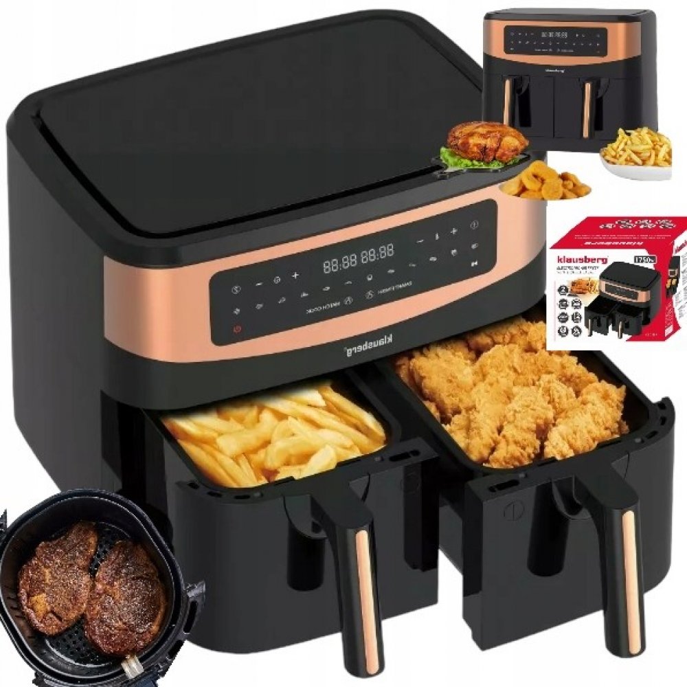 Frytownica beztłuszczowa 9.0L firmy KLAUSBERG. Dzięki frytownicy z podwójnym koszem marki Klausberg przygotujesz dwa różne dania w tym samym czasie - wystarczy napełnić kosze składnikami, wprowadzić ustawienia i pozwolić mocy gorącego powietrza przygotować jedzenie bez dodatku tłuszczu! Przekąski zawsze będą chrupiące z zachowaniem pełni smaku. Takie rozwiązanie pozwala cieszyć się ulubionym jedzeniem w zdrowej wersji, ze znacznie mniejszą ilością kalorii.Cechy:Smażenie w technologii szybkiej cyrkulacji powietrza.Smażenie zdrowego, niskotłuszczowego, smacznego jedzenia.Smaczne jedzenie i przekąski przyrządzane z ograniczeniem frytury i innych tłuszczy.Do 80% mniej tłuszczu.Cyfrowy wyświetlacz, ekran dotykowy.Przyrządź dwa dania jednocześnie w tym samym czasie.Do przygotowania potraw można wybrać jeden lub dwa kosze. Nieprzywierająca powłoka, łatwa do czyszczenia.Pojemność: podwójny kosz 4,5 l, łącznie 9 lWymiary koszyka wewnątrz 23 x 15 x 12,5 cm.Ogrzewanie z obiegiem powietrza 360°Regulacja czasu pieczenia (Timer: 60 minutowy)Regulacja temperatury 50-200 ℃Inteligentne zakończenie pracy: obie strefy kończą gotowanie w tym samym czasie.Dopasowanie ustawień: obie strefy mają tę samą temperaturę i timerNapięcie:220 - 240vCzestotliwość:50/60HzDługość przewodu zasilającego: 100 cm.Moc:1750WWaga: 7,7 kg. Barva: Černé, Hnědé. Materiál: inny. Power: 1750 W. Volume : 7 l.