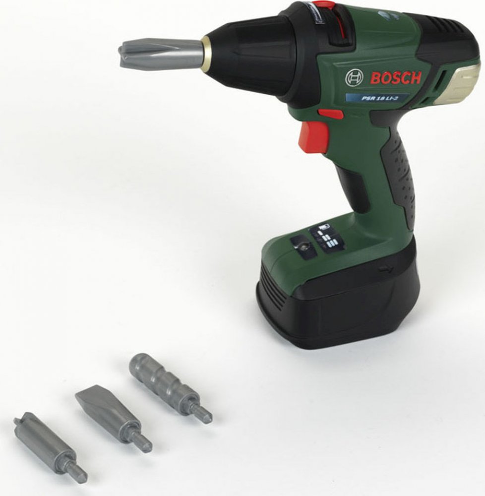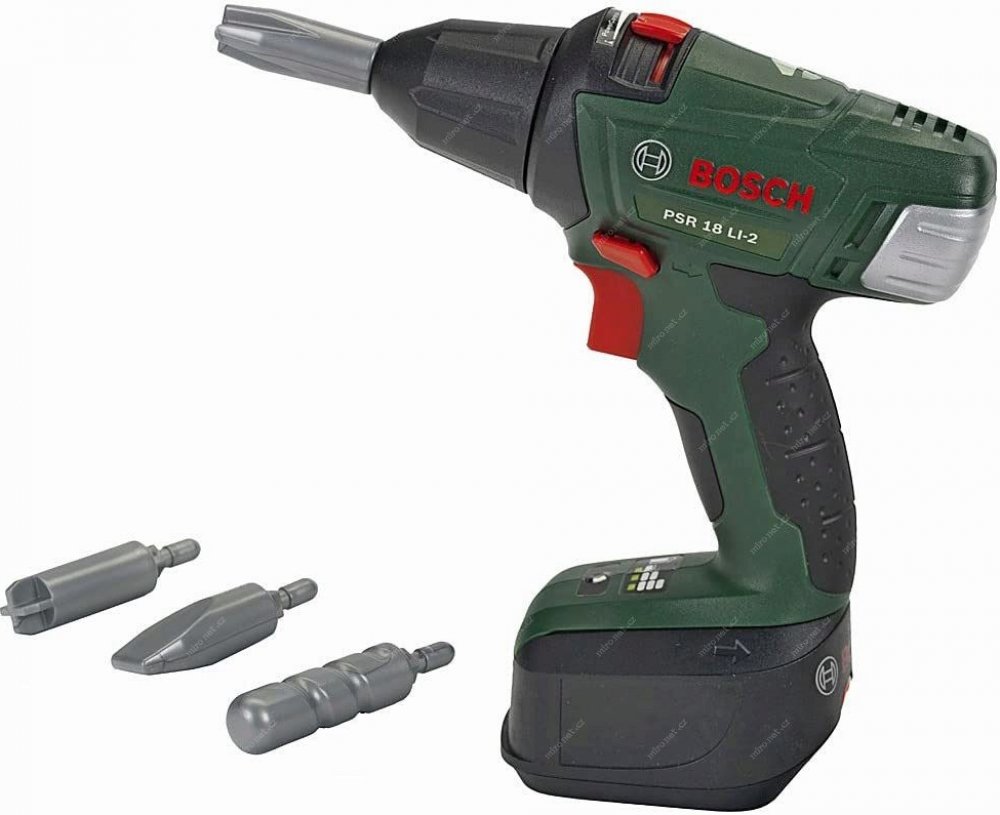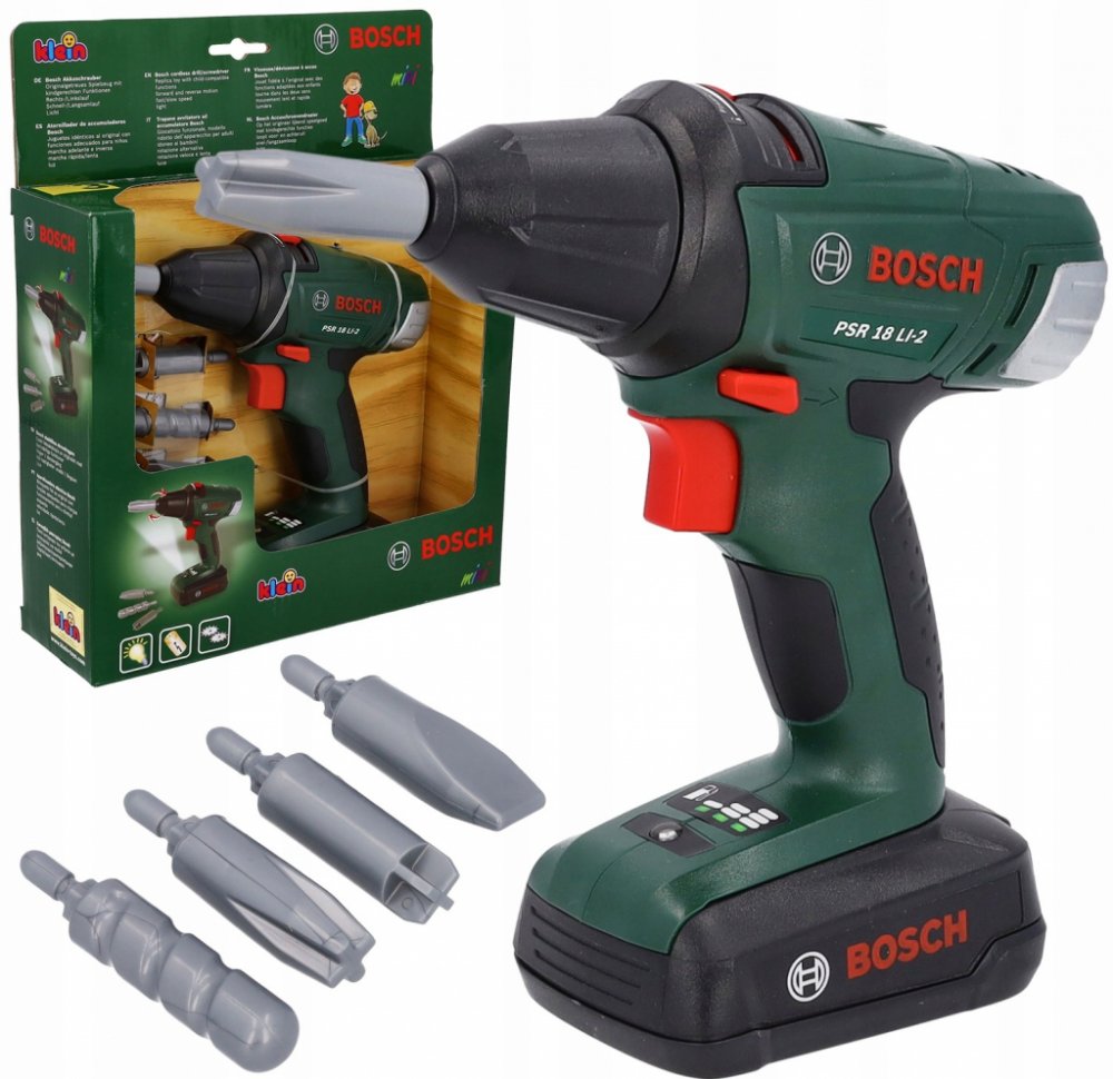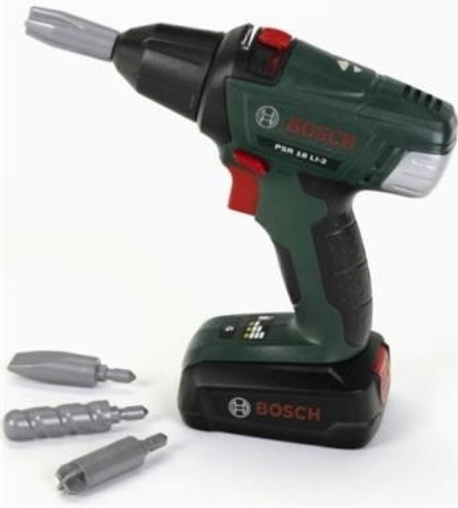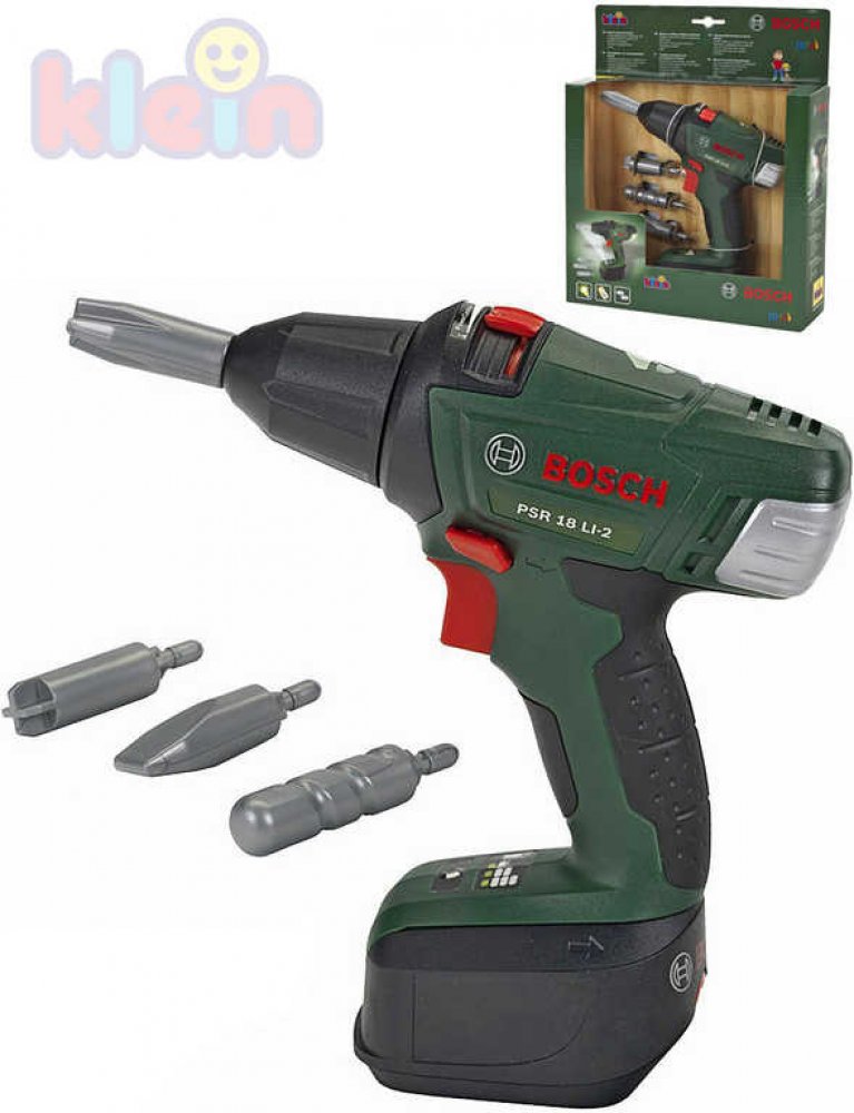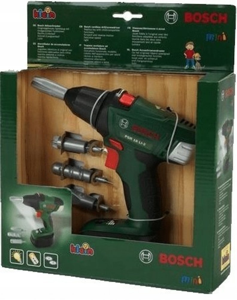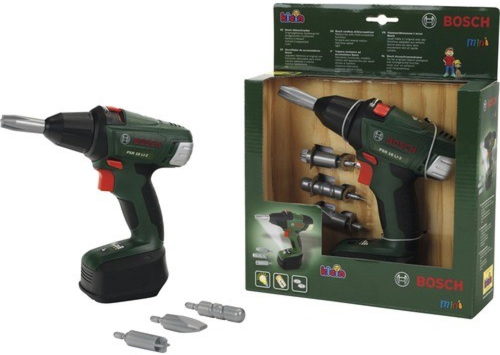 Plastová akuvrtačka KLEIN BOSCH pro děti, je zábavnou realistickou hračkou pro kluky, kteří si chtějí hrát na velké řemeslníky. Vrtačka vypadá jako opravdová. Má vyměnitelné 4 nástavce. Na rukojeti vrtačky je tlačítko k uvedení vrtačky do chodu (zámek / vpřed / vzad). Hračka s LED světlem a zvukem na baterie.
