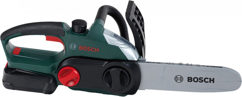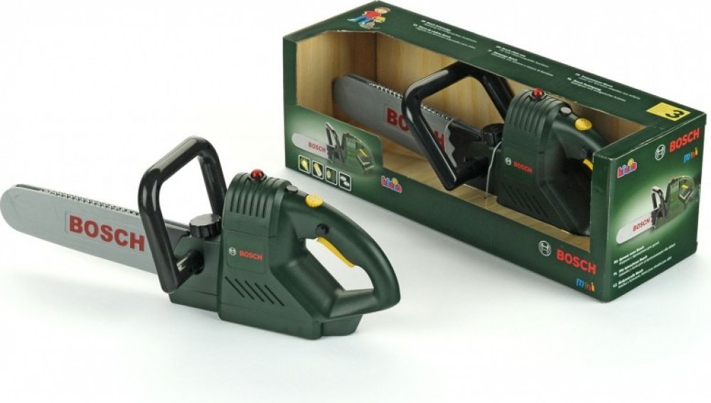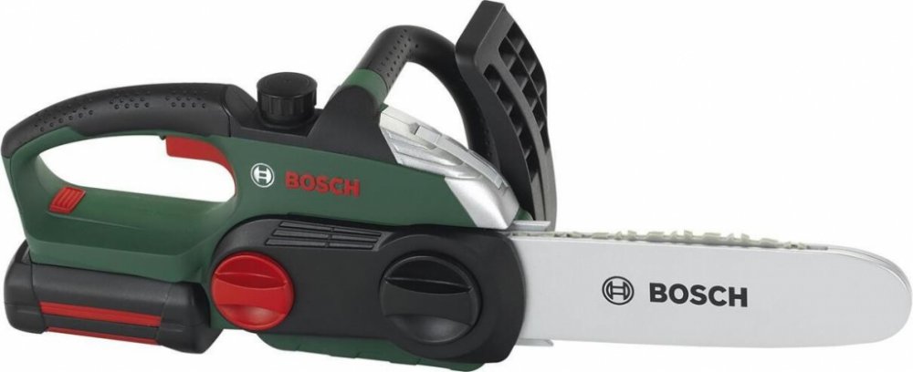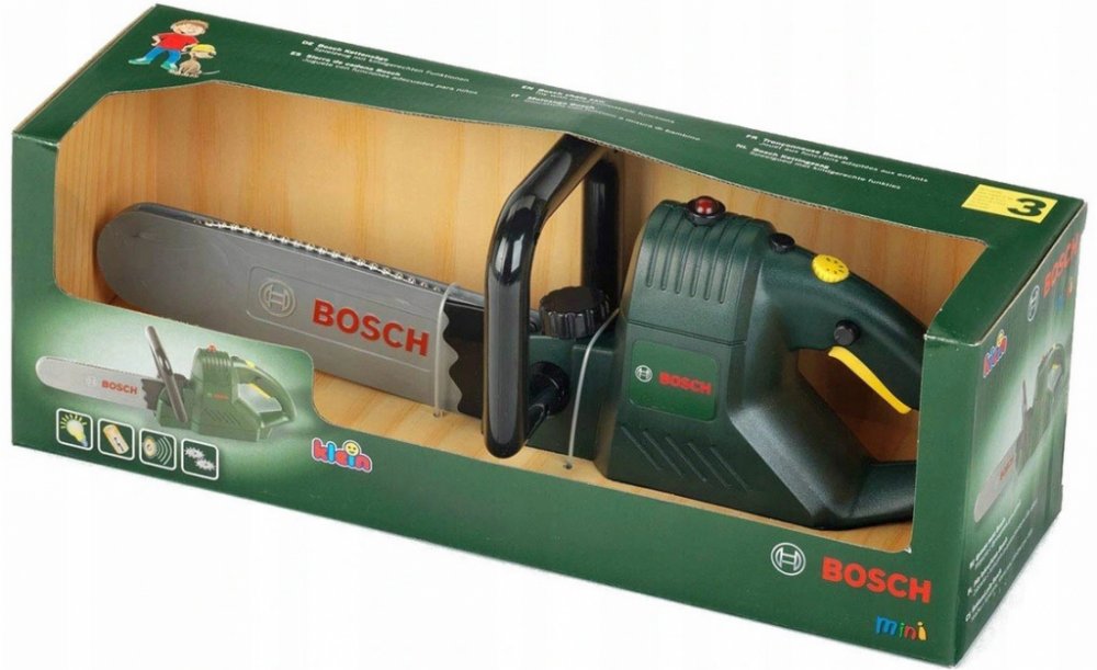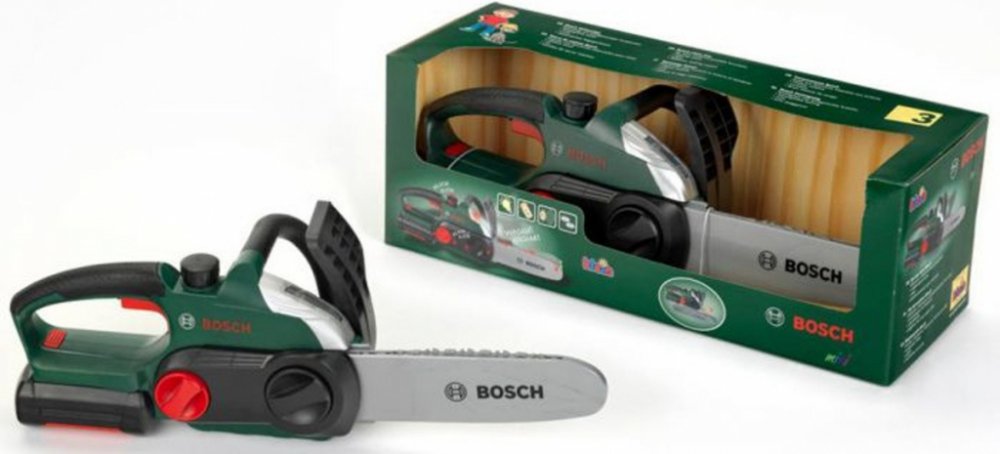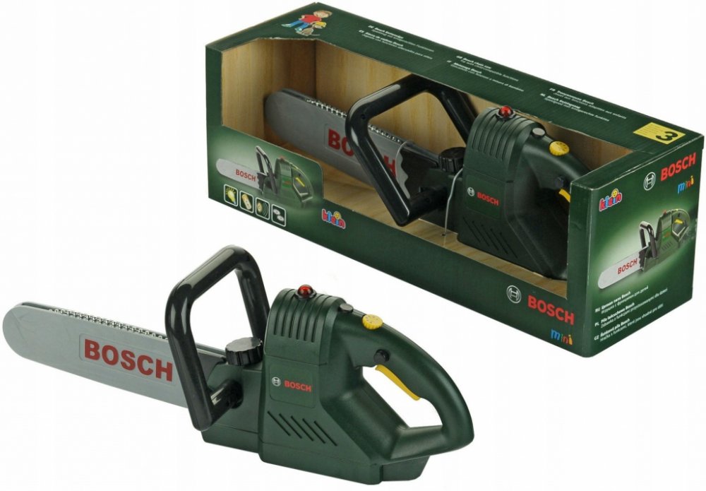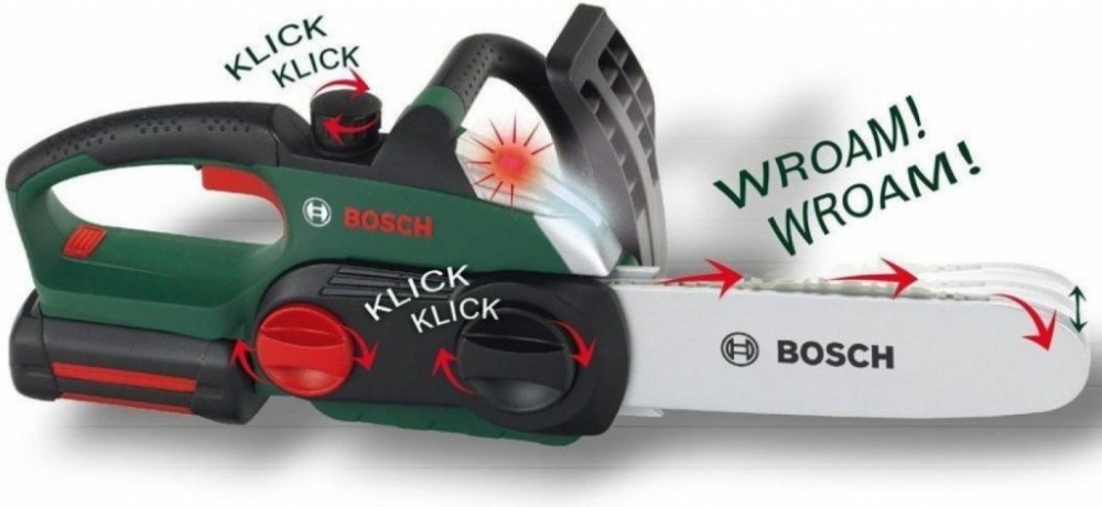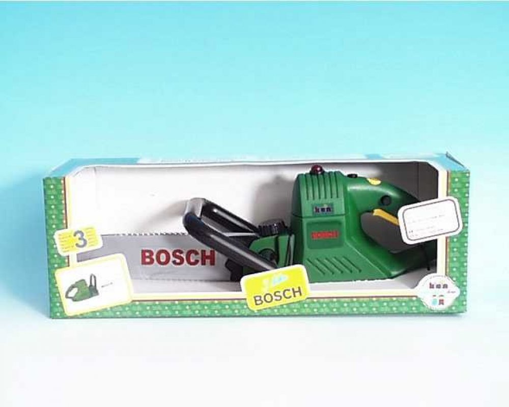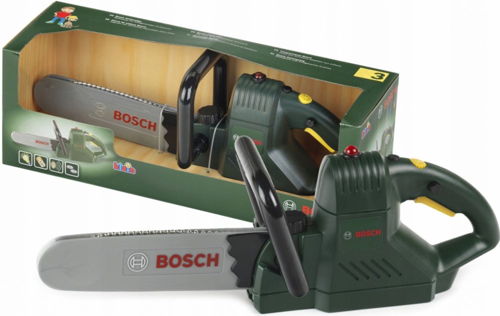 Dětská motorová pila v licenci značky Bosch vydává zvuky jako opravdová. Má pohyblivý řetěz, svítí, vydává zvuky u otáčení s uzávěry a různými kolečky.