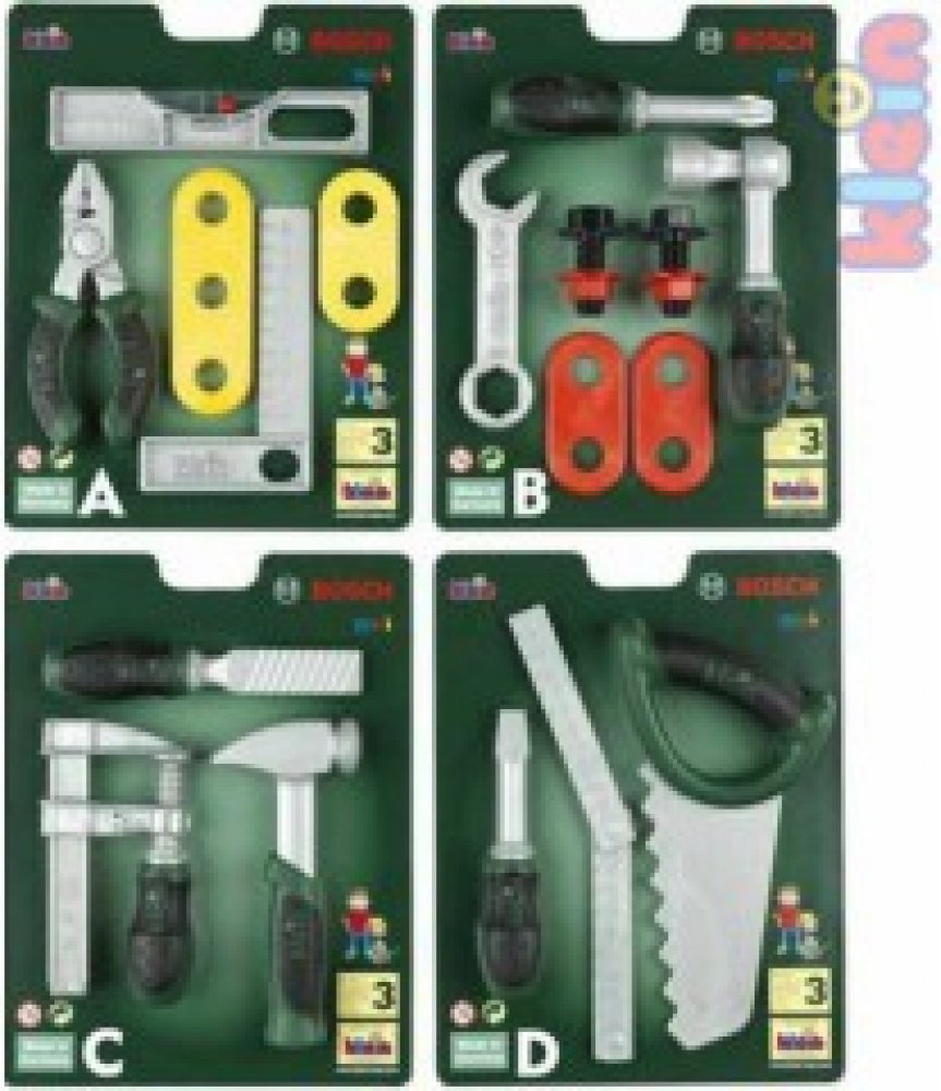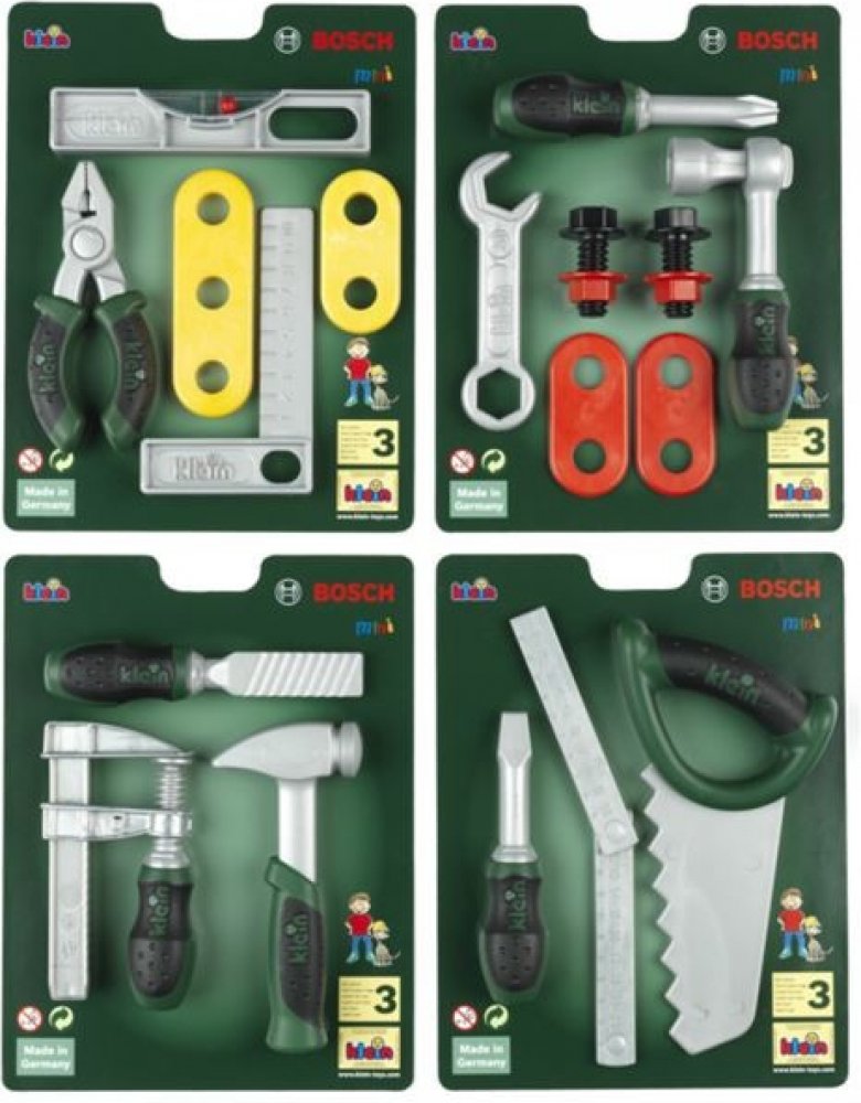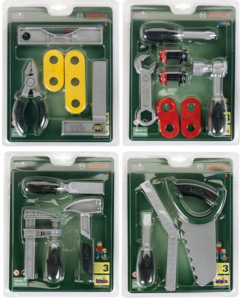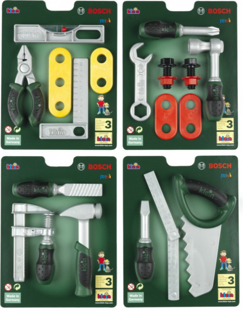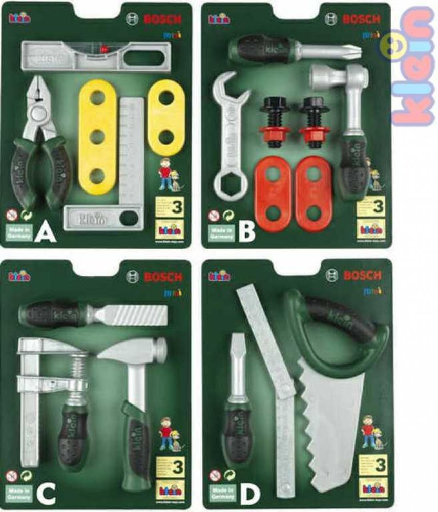 Našli jste co jste hledali. Toyboom má zboží s názvem: KLEIN Set plastové dětské nářádí na kartě BOSCH 4 druhy. Vybrali jsme pro vás nejlepší z kategorie: dětské nářadí. Dětská sada s nářadím z plastu pro malé děti - domácí kutily. Klučičí nářadí v licenci Bosch. V nabídce jsou 4 varianty - každá obsahuje něco jiného.
