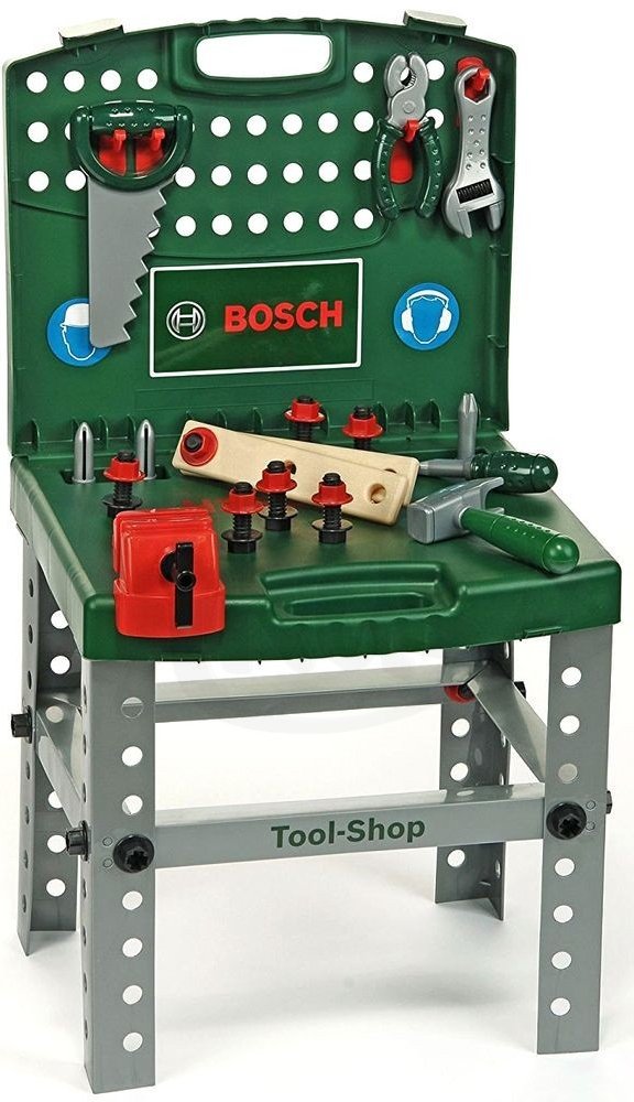 Pracovní stůl Bosch v praktickém kufříku s nářadím Bosch - pila, šroubovák, klíč, kleště, svěrák, kladivo, šrouby, matky a další doplňky pro montování. Součástí je i aku šroubovák s výměnným nástavcem a charakteristickým zvukem. Pracovní stůl Bosch je úžasná hračka pro malé kutily.