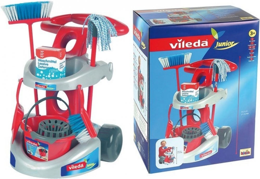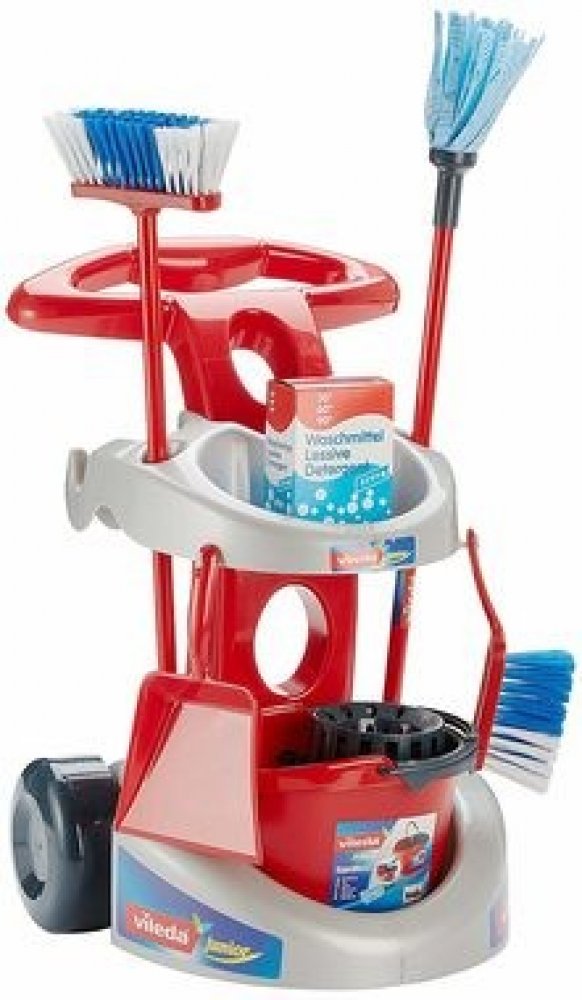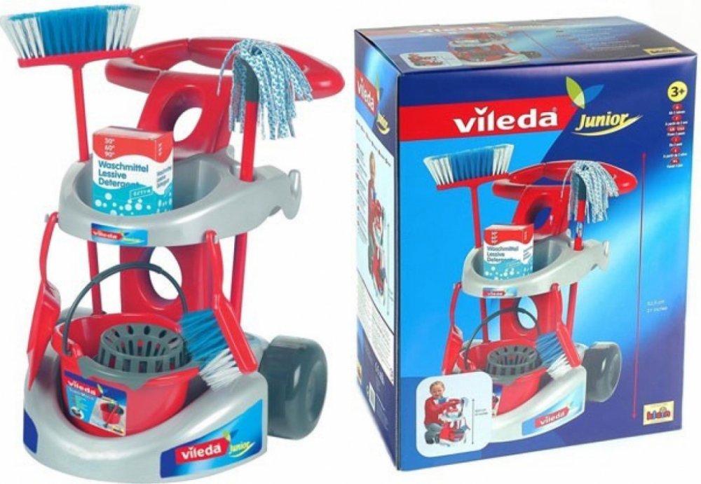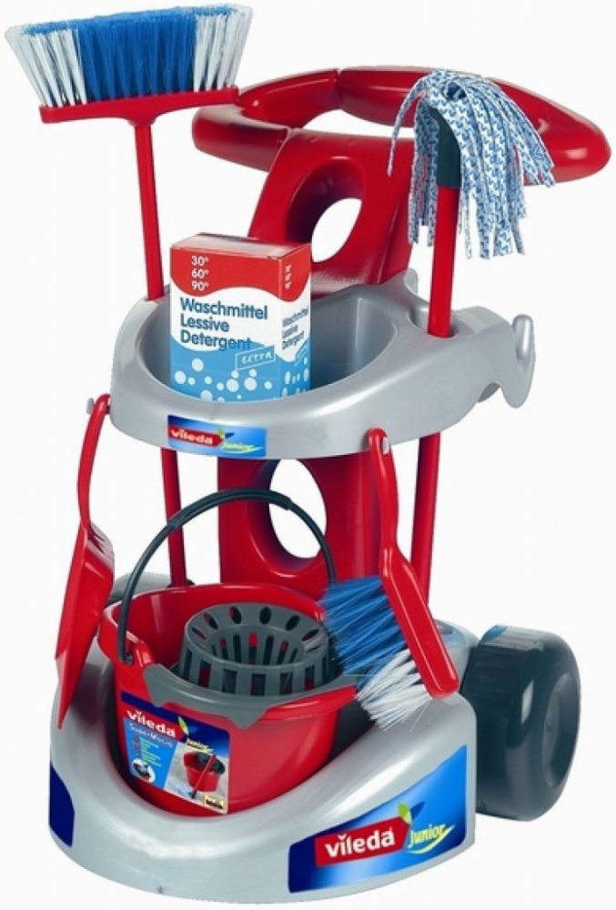 Tento skvělý set pro každého malého uklízeče, vytvořený pod licencí společnosti Vileda, je vyroben společností Klein, kterou děti milují a rodiče si jí váží. Ústředním prvkem sady je šedočervený vozík s velkými černými koly, která usnadňují pohyb po rovných plochách, a červenou rukojetí pro tlačení vozíku. Tento vozík je vybaven různým příslušenstvím, takže se dítě může zapojit do každodenního úklidu nebo napodobovat rodiče při této činnosti. Obsahuje červený kbelík na mop se ždímačem, mop a kartáč na červené tyči, zametač s lopatkou a krabici s čisticím prostředkem (panáček). Sada se snadno sestavuje a je vyrobena s důrazem na kvalitu. Všechny přiložené doplňky jsou mini verzí skutečných úklidových pomůcek, takže dítě může skutečně dělat to, co dělají rodiče. Úklidový vozík Vileda Junior od společnosti Klein je ideální hračkou pro každé dítě, které rádo napodobuje své rodiče při jejich každodenních povinnostech. Rychle se stane oblíbenou hračkou vašeho dítěte.