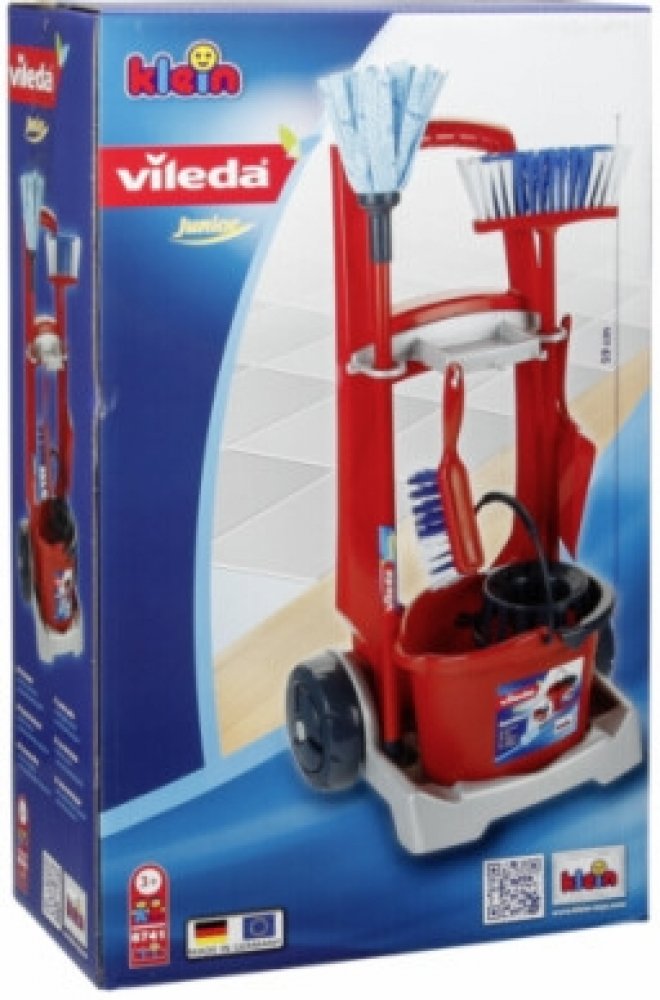 Vyrobeno společností Klein, kterou milují děti a cení si jí rodiče, je to skvělá sada pro každého malého uklízeče, vytvořená v licenci společnosti Vileda. Ústředním prvkem sady je šedočervený vozík s velkými černými koly, která usnadňují pohyb po rovném povrchu, a červenou rukojetí, kterou lze vozík tlačit. Tento vozík je vybaven různým příslušenstvím, takže se dítě může zapojit do každodenního úklidu nebo napodobovat rodiče při této činnosti. Obsahuje červený kbelík na mop s černým ždímacím zařízením, mop a kartáč na červených tyčích a červený zametač s lopatkou. Sada je snadno sestavitelná a vyrobená s důrazem na kvalitu. Veškeré přiložené příslušenství je mini verzí skutečného úklidového příslušenství, takže dítě může skutečně dělat to, co rodiče. Úklidový vozík Vileda Junior od společnosti Klein je ideální hračkou pro každé dítě, které rádo napodobuje své rodiče při každodenních povinnostech. Rychle se stane oblíbenou hračkou vašeho dítěte.Sada