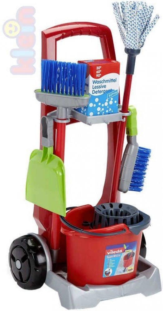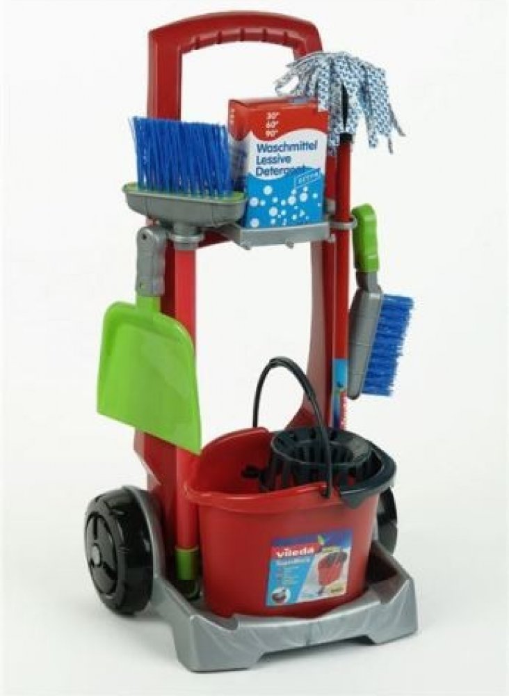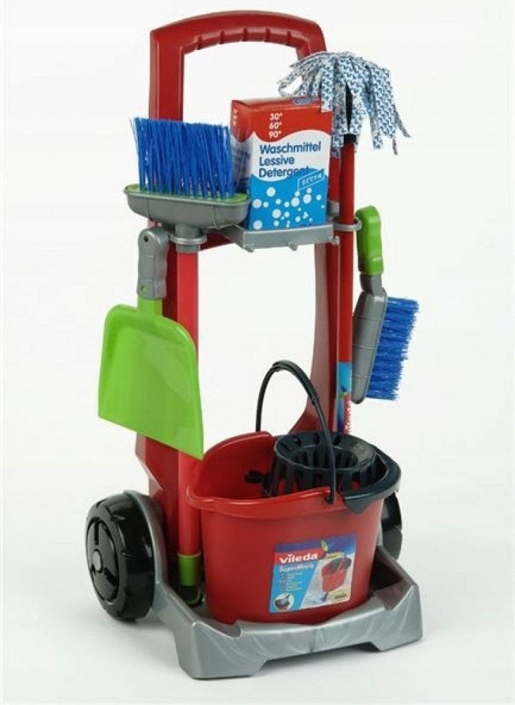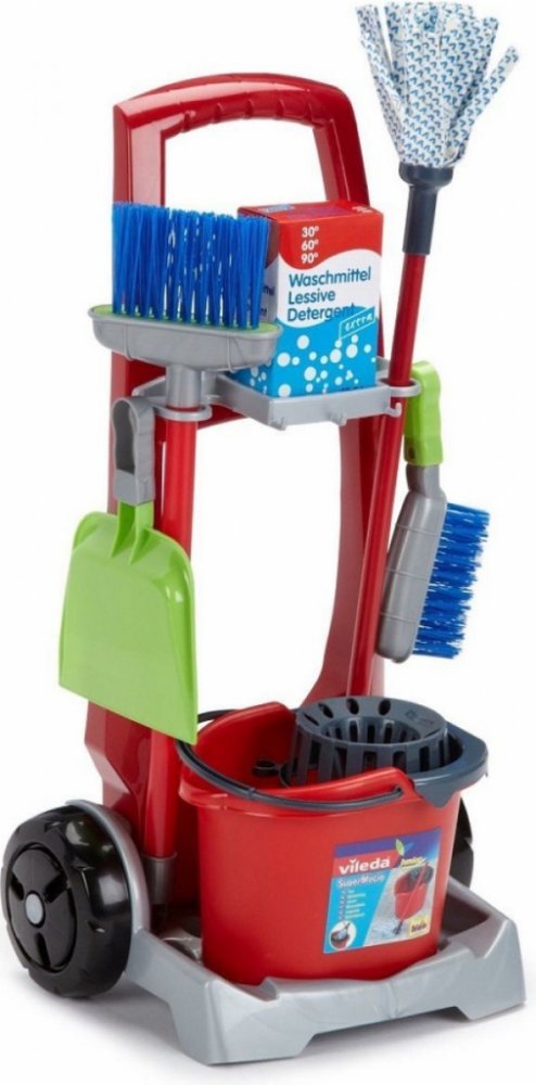 Uklízecí plastový vozík pro děti značky Vileda v červené barvě, s celou řadou dalších doplňků, pro všechny malé uklízečky a pomocníky v domácnosti.