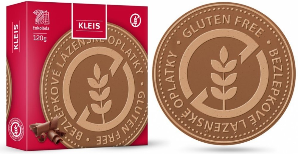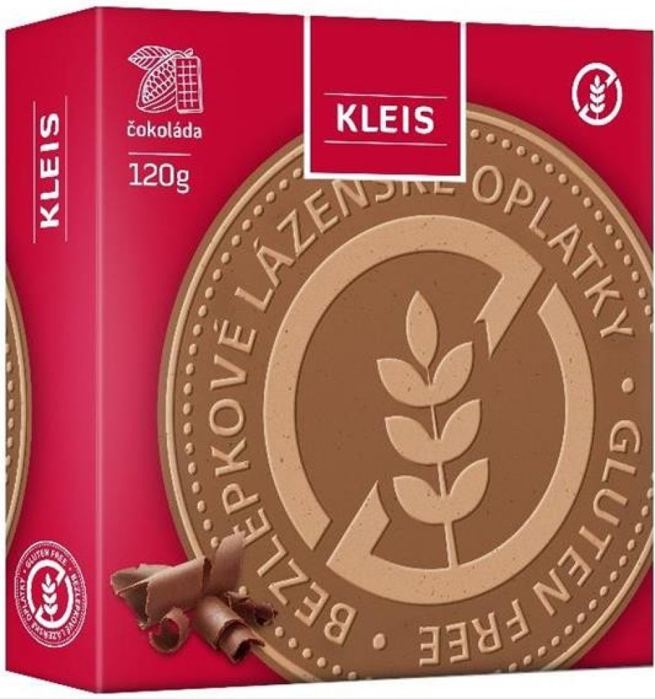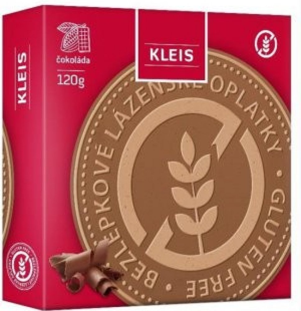 Kleis Lázeňské oplatky čokoládové bez lepku 120 g. Bezlepkové lázeňské oplatky jsou vyrobeny klasickým způsobem a vynikají svou nezaměnitelnou chutí. Jsou určeny pro ty co nemohou ořechy nebo ty co milují čokoládu. Složení: Bezlepková rýžová mouka, tapioková mouka, kukuřičný škrob, bramborový škrob, kukuřičná mouka, xanthan (E415), cukr, nehydrogenovaný rostlinný tuk (palmový olej, bambucký olej,...